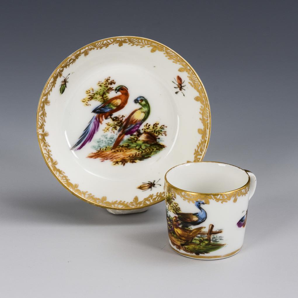 Zylindertässchen mit Ohrenhenkel. Schauseitig auf der Tasse die Darstellung eines Pfaus mit Henne sowie im Spiegel der Untertasse die Darstellung eines exotischen Fasanenpaares.
