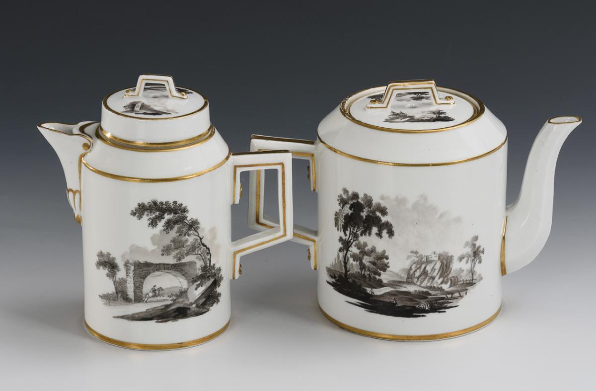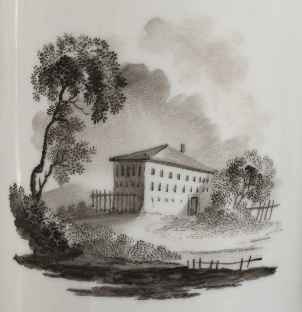 Zylinderkannen mit gewinkelten Henkeln und Deckel mit gewinkeltem Griff. Beidseitig die Darstellung einer Landschaft mit Architektur. Minimaler Goldabrieb, Bestoßung an 1 Schneppe.