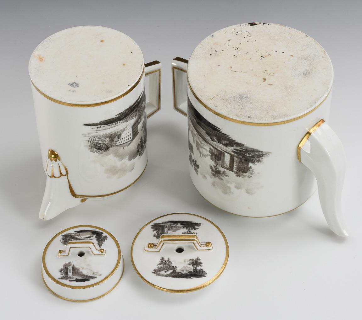 Zylinderkannen mit gewinkelten Henkeln und Deckel mit gewinkeltem Griff. Beidseitig die Darstellung einer Landschaft mit Architektur. Minimaler Goldabrieb, Bestoßung an 1 Schneppe.