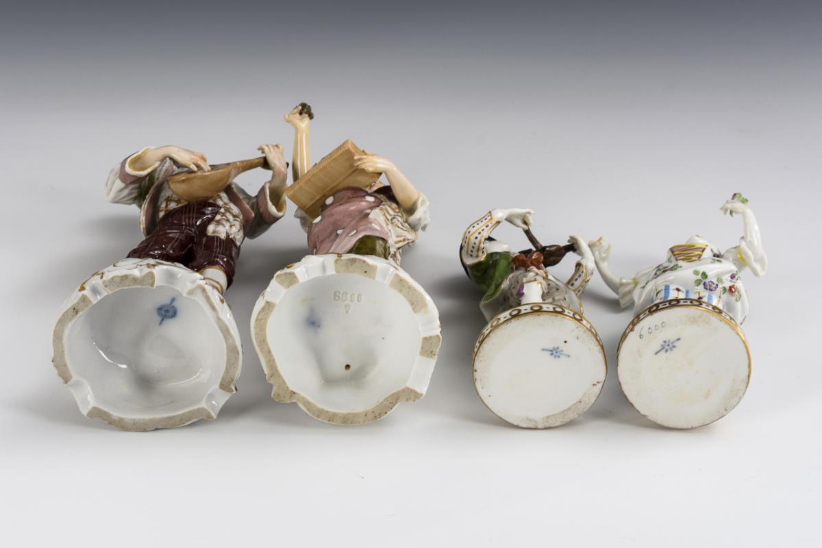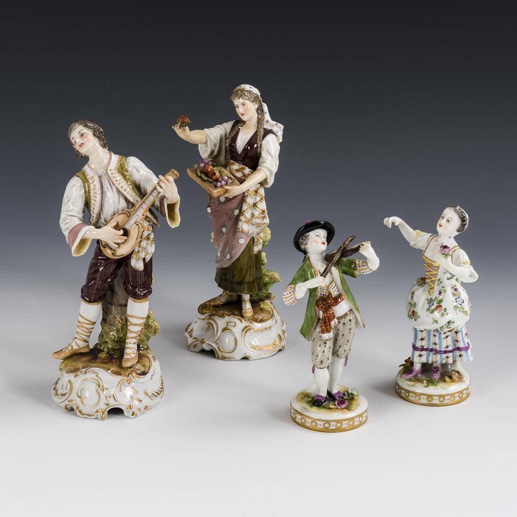 1x Mandolinenspieler, Granatapfel- und Traubenverkäuferin, Violinenspieler und Gärtnermädchen. Mandolinenkopf restauriert, rechte Hand der Verkäuferin restauriert, Violinenbogen geklebt, Violinenkopf fehlt, Blüten partiell bestoßen.