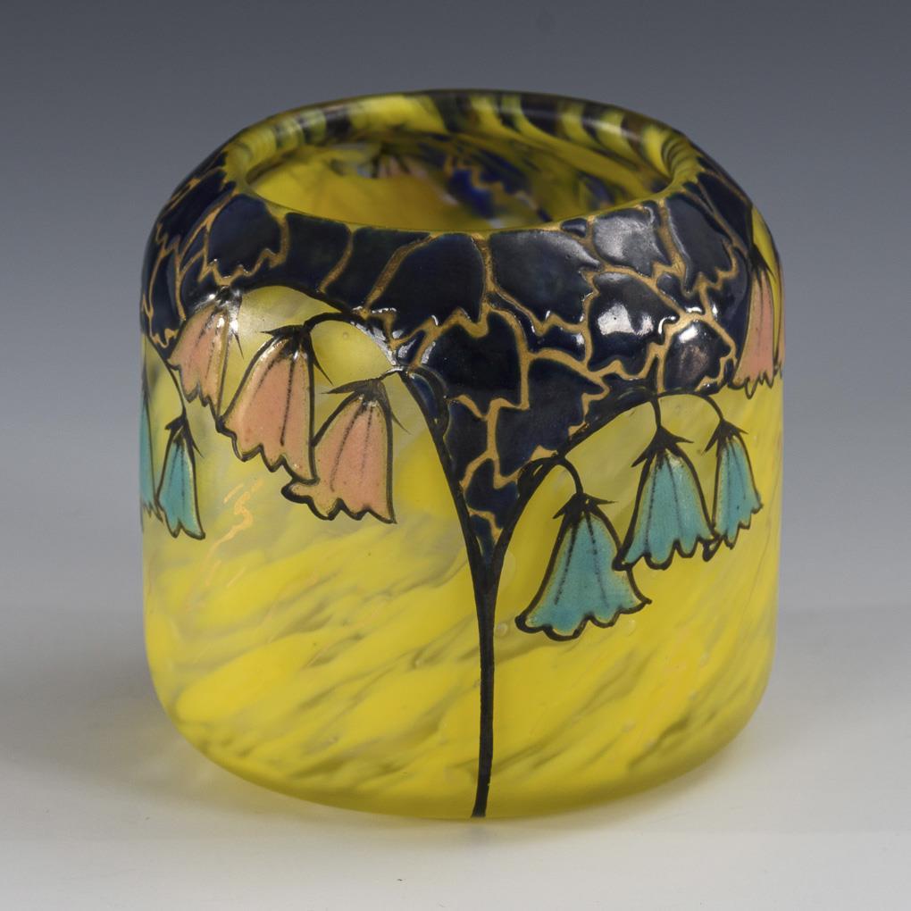 Kleine zylindrische Vase mit eingezogenem Mündungsrand. Umlaufend polychrom emailgemalte, stilisierte Glockenblumen.