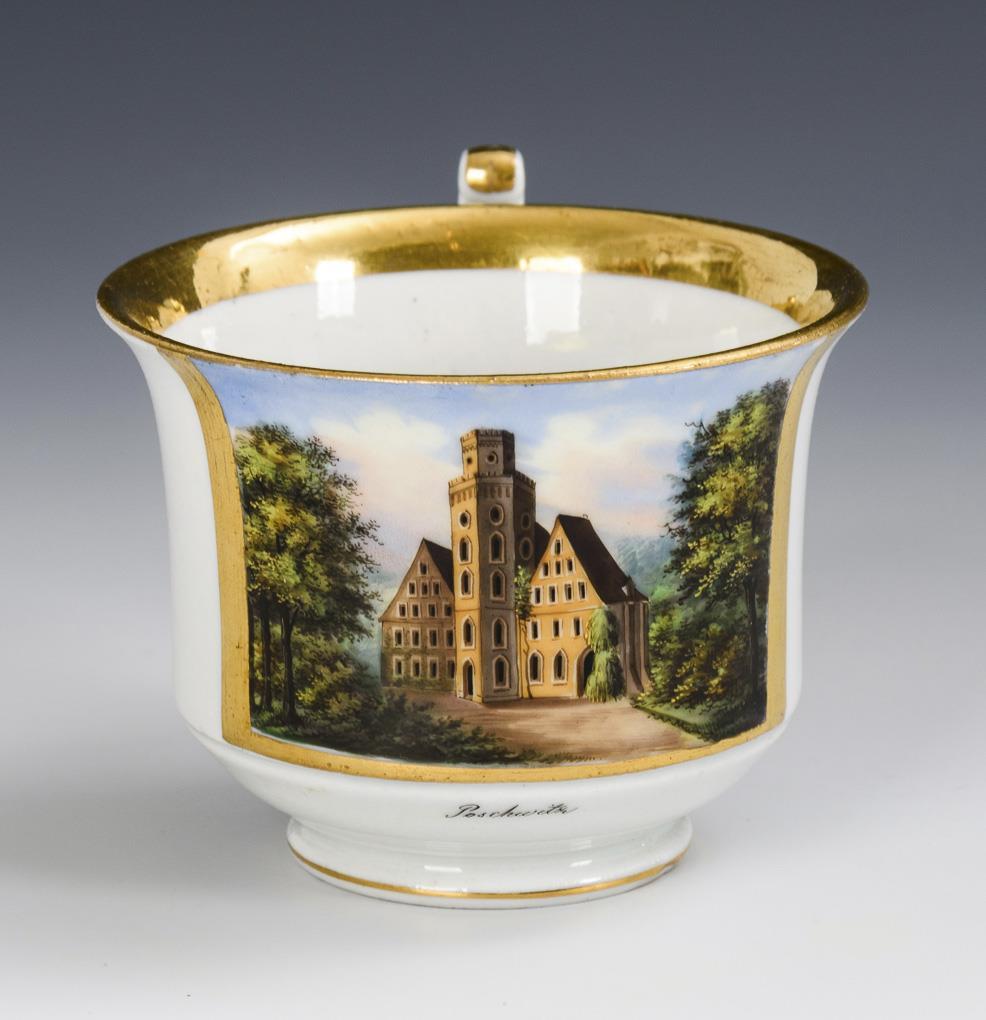 Gefußte Glockentasse mit spitz geschweiftem Henkel. Schauseitig eine goldgerahmte Rechteckkartusche mit der bezeichneten Ansicht des Poschwitzer Schlosses bei Altenburg. Ohne Untertasse.