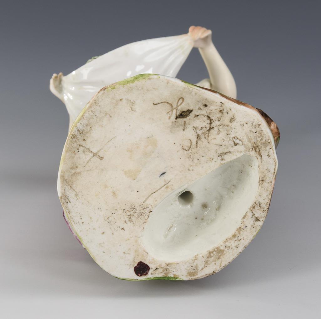 An einem Baumstamm stehende Frau, in ihrer Schürze ein Vogelnest mit Jungvögeln tragend. Linker Arm und Hut restauriert, "Gras" bestoßen.