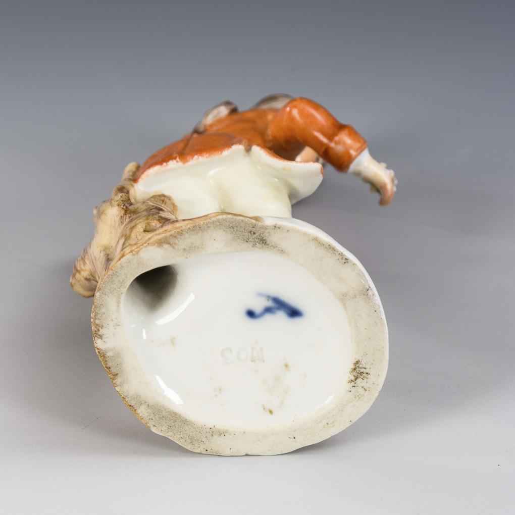 An einem Baumstamm stehender Gärtner mit Blume und Traubenkorb. Rechte Hand restauriert, Restaurierung am Sockelrand.