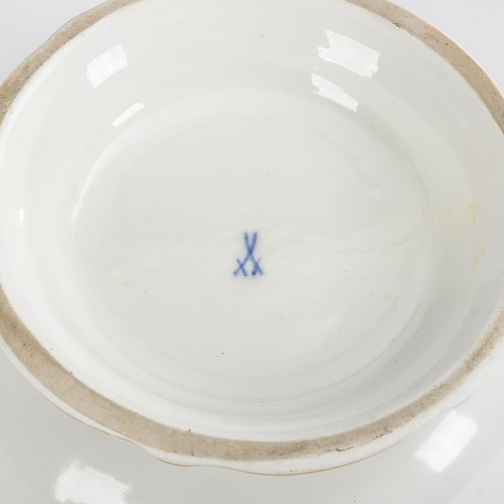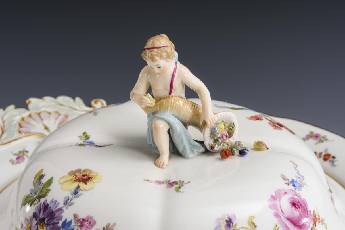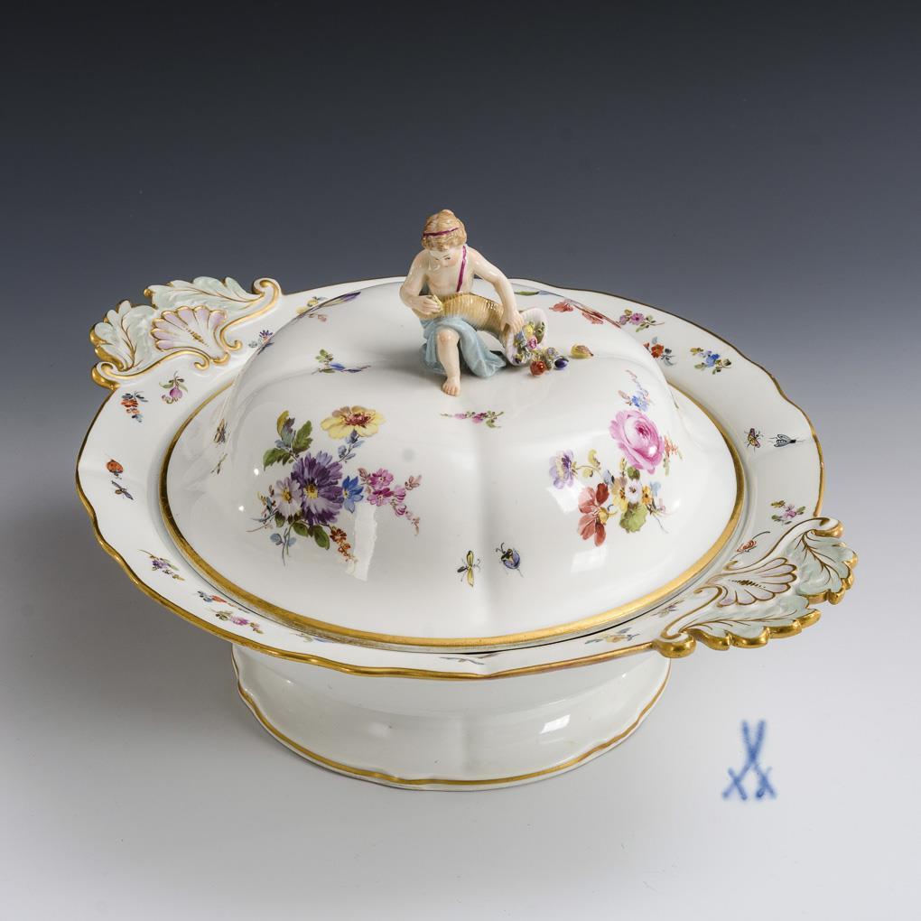 Form "Neuer Ausschnitt". Schüssel mit zwei Blatthandhaben und der Figur eines Putto mit Füllhorn als Deckelknauf. Restauriert, Blüten und Früchte des Füllhorns etwas bestoßen.