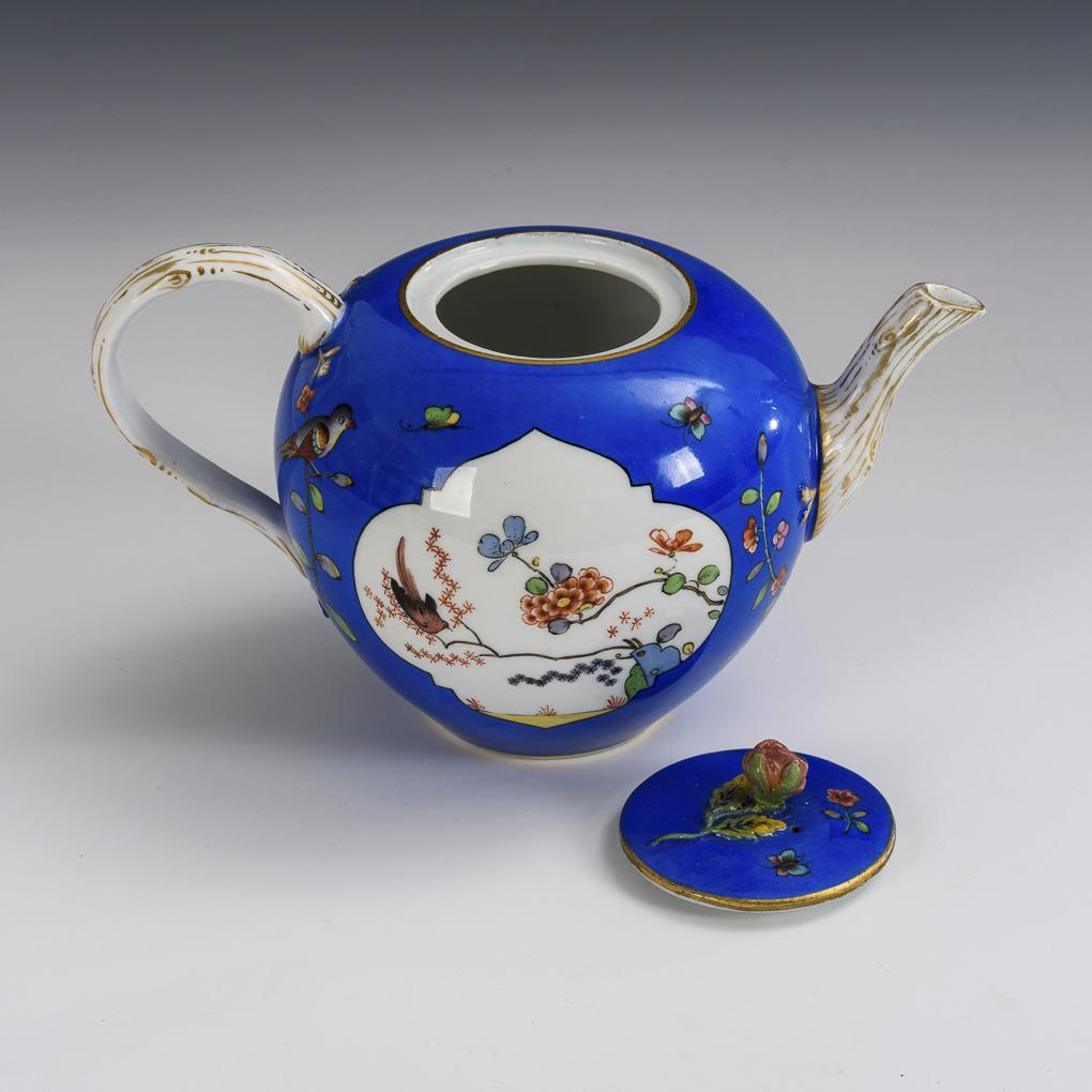 Bauchiges Kännchen mit Asthenkel, Astschneppe und Blütenknaufdeckel. Blauer Fond mit Blumen- und Vogelmalerei sowie beidseitig eine Kartusche mit Blumen- und Vogelmalerei. Knauf und Schneppe restauriert.