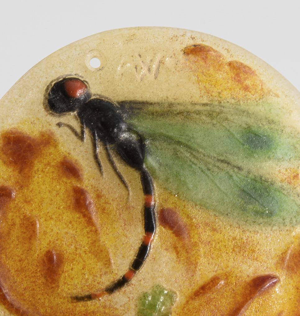 Medaillon mit dem Relief einer Libelle auf einer Blüte.