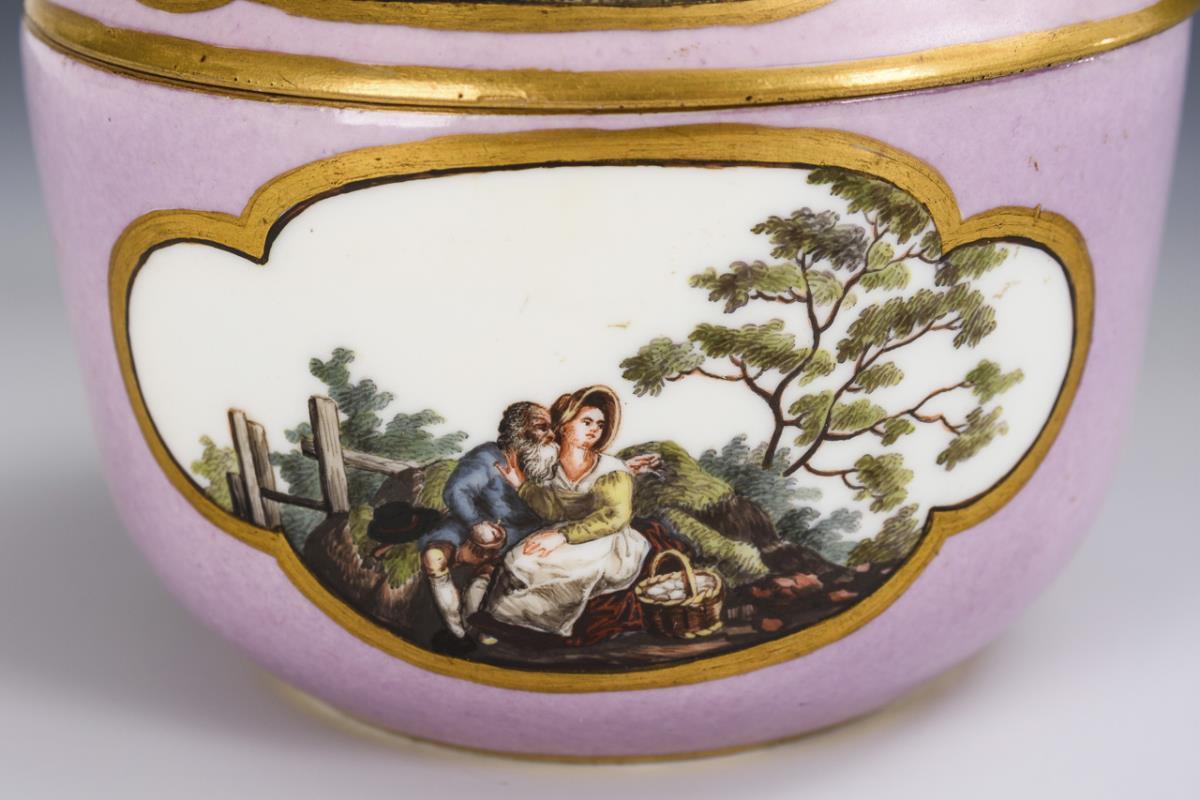 Zylinderdose mit Blütenknaufdeckel. Violetter Fond. In goldgerahmten Vierpasskartuschen die Darstellung von Bäuerinnen und Bauern. Kleiner Kratzer auf dem Fond.