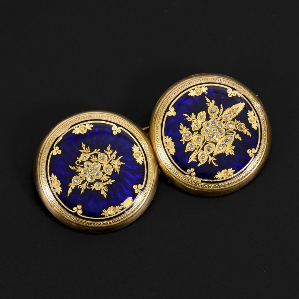Aus antikem Uhrengehäuse gestaltete Brosche mit kleinen Diamantrosen in floralen Gravuren zwischen blauem Email. Kugelhaken.