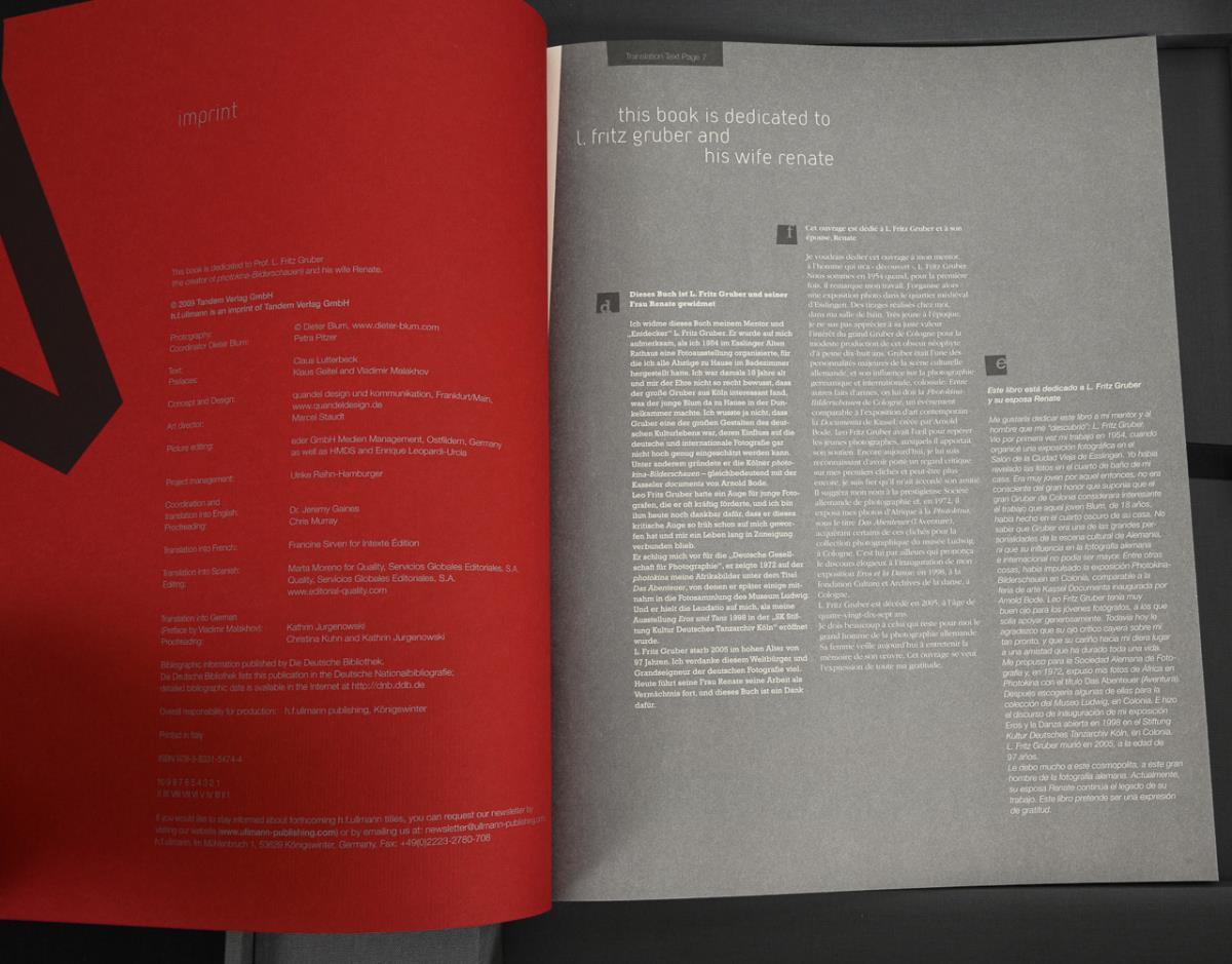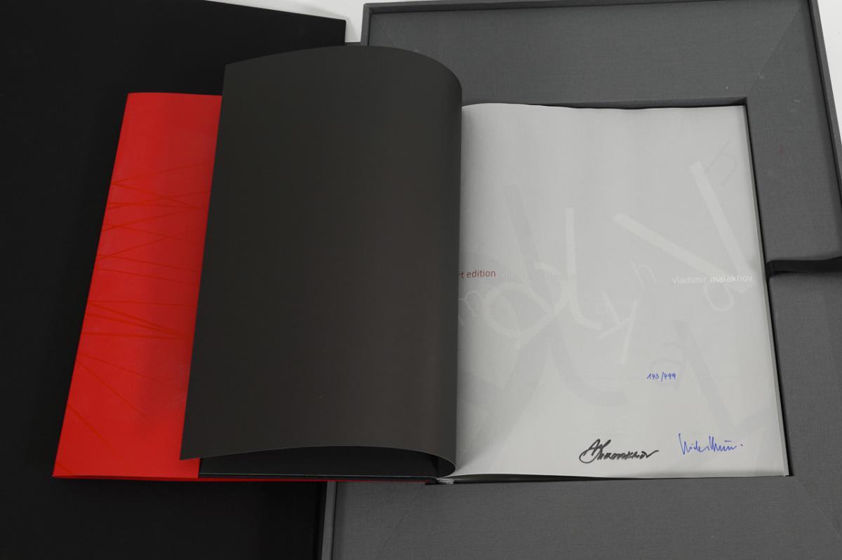Nummeriertes Exemplar 143/499, handsigniert von beiden Künstlern, 223 Seiten, im roten Schutzumschlag. Dreisprachiges Beiheft (deutsch, spanisch, französisch) mit rotem Broschur-Einband, 37 Seiten. Signierte Originalfotografie in Mappe, Blindstempel "Skia Photgraphy". Alles in großer Kassette und in Originalverpackung.