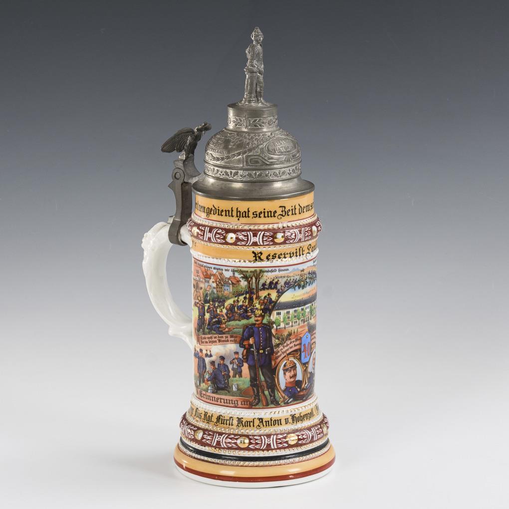 Profilierter Krug mit Soldaten-Reliefbüste am Henkel sowie verzierter Zinndeckel mit Rekrut (Lupenminiatur im Kopf) und Adlerdrücker. Wandung mit Bildnissen (Kaiser Wilhelm II. und Karl Anton), Leopoldskaserne II, Soldatenszenen, Sinnsprüchen sowie Namensliste. "Reservist Lautenberg. 8. Comp. Füs. Rgt. Fürst Karl Anton von Hohenzoll. Nr. 40 Rastatt." . Montierung am Henkel locker, etwas berieben, Miniatur ohne Bild.