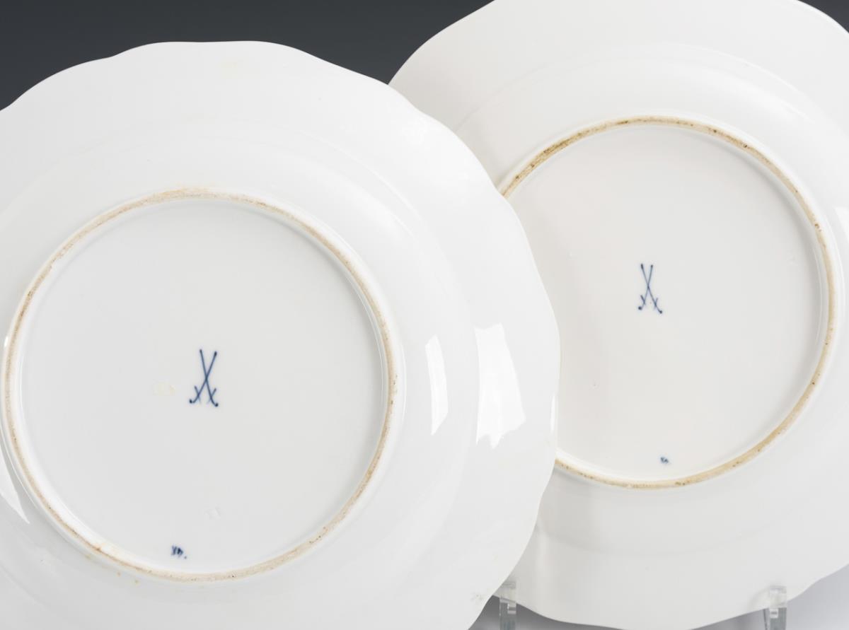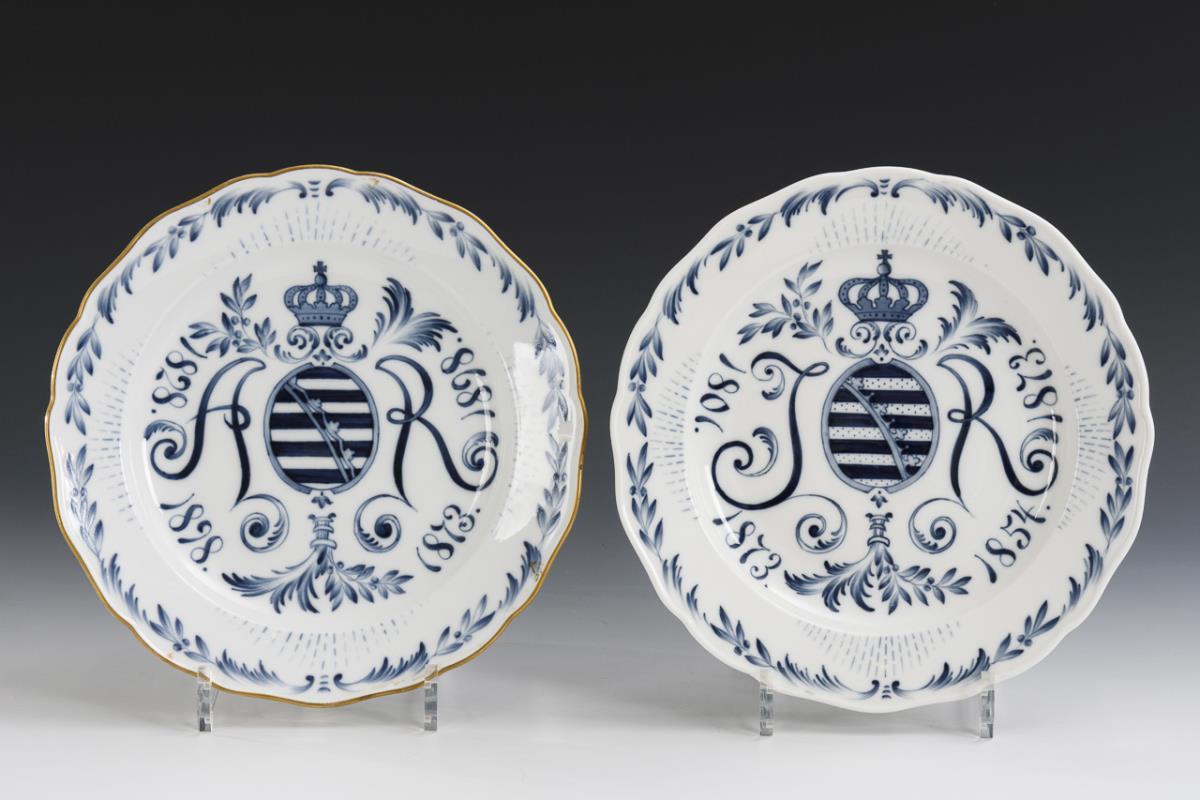 Form "Neuer Ausschnitt". Teller mit dem sächsischen Wappen im Spiegel: 1x Jubiläumsteller zum 70. Geburtstag von König Albert von Sachsen (1828-1902, König ab 1873) mit dem Monogramm "AR" und den Jahreszahlen 1828, 1898, 1873, 1898; 1x Gedenkteller anlässlich des Todes von König Johann von Sachsen (1801-1873, König ab 1854) mit dem Monogramm "JR" sowie den Jahreszahlen 1801,1873, 1854, 1873.
