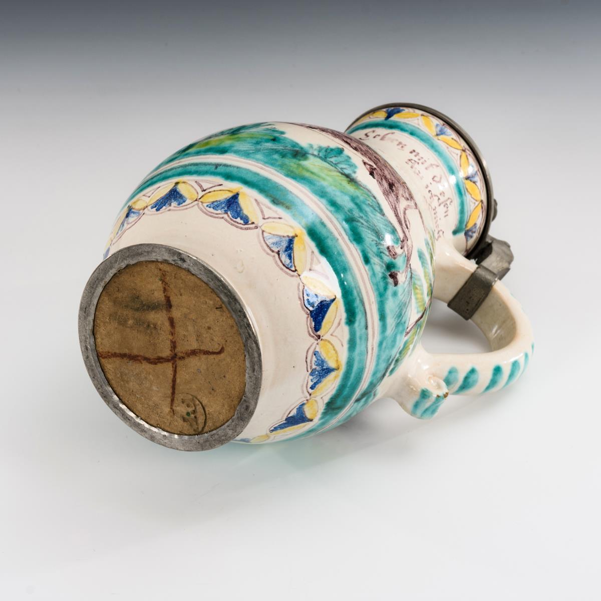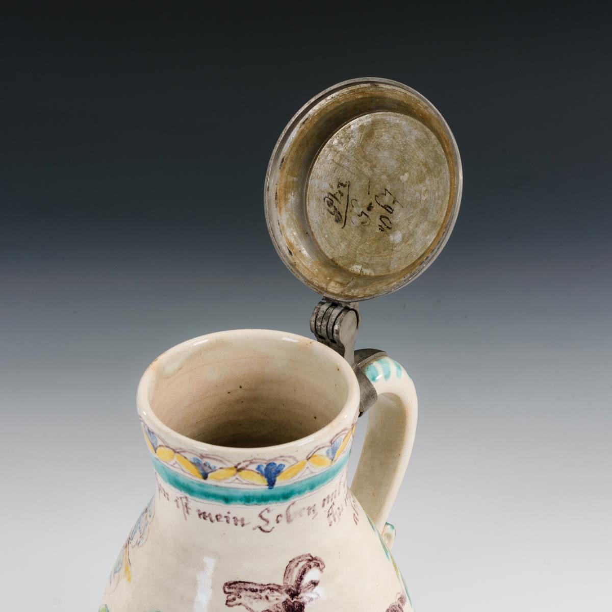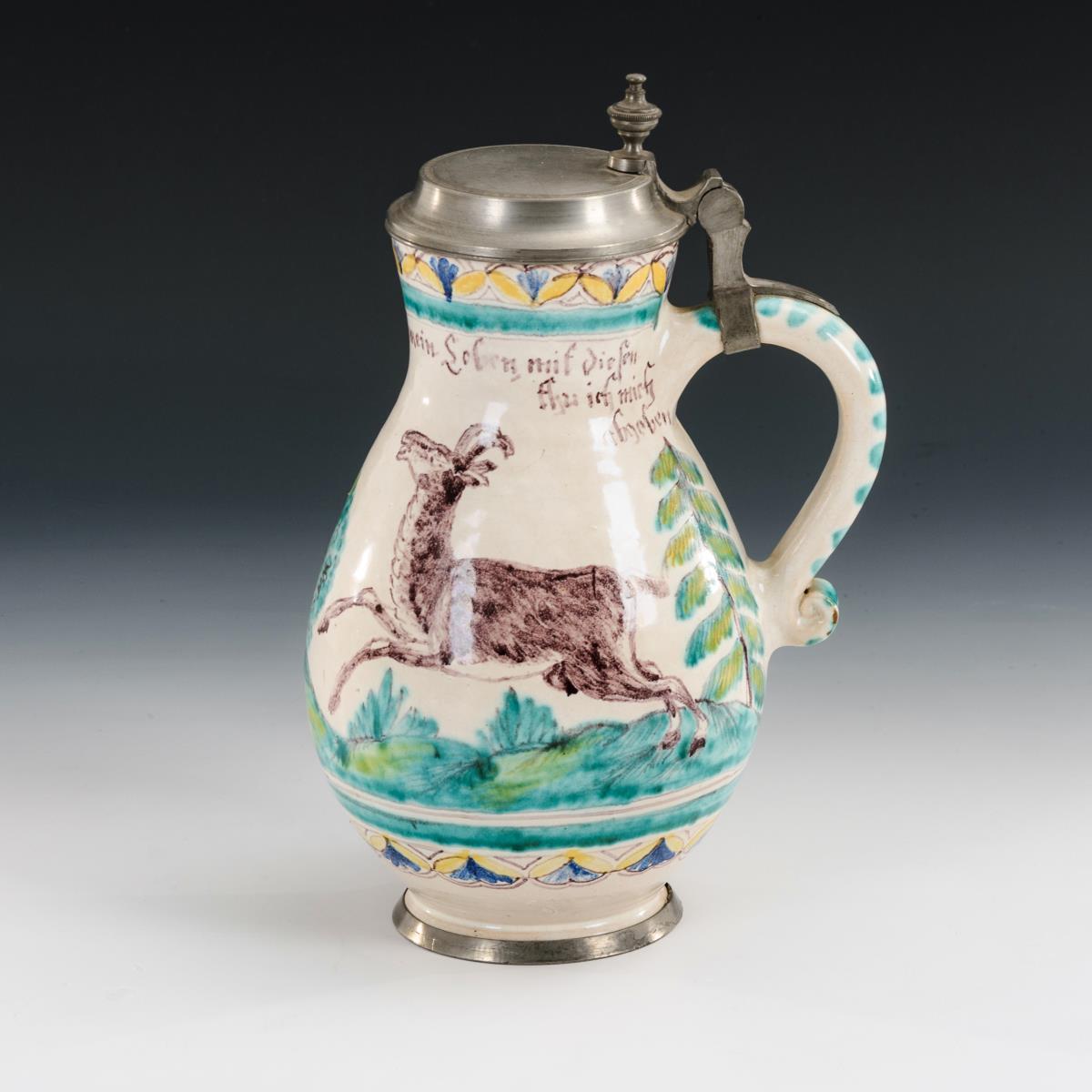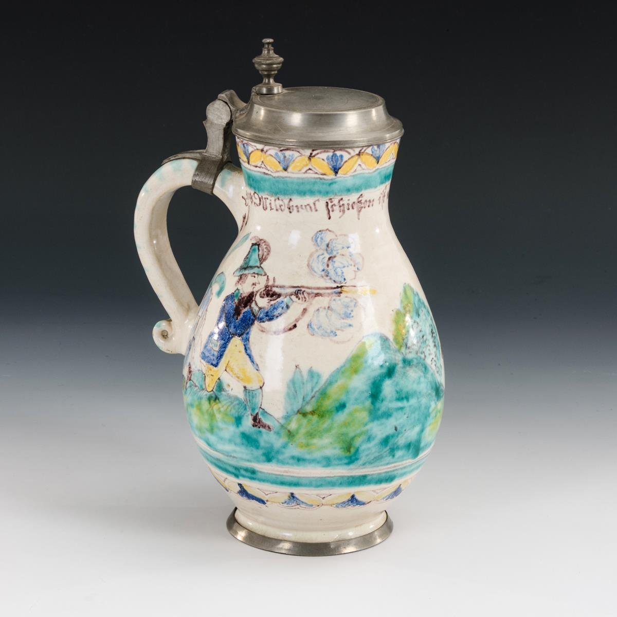 Birnform mit endvolutiertem Bandhenkel. Schauseitig ein schießender Jäger und ein Hirsch, darüber ein Jagdspruch. Flacher Zinndeckel mit Kugeldrücker, Zinnstandring. Am Henkel eine kleine Bestoßung, Deckel mit Kratzspuren.