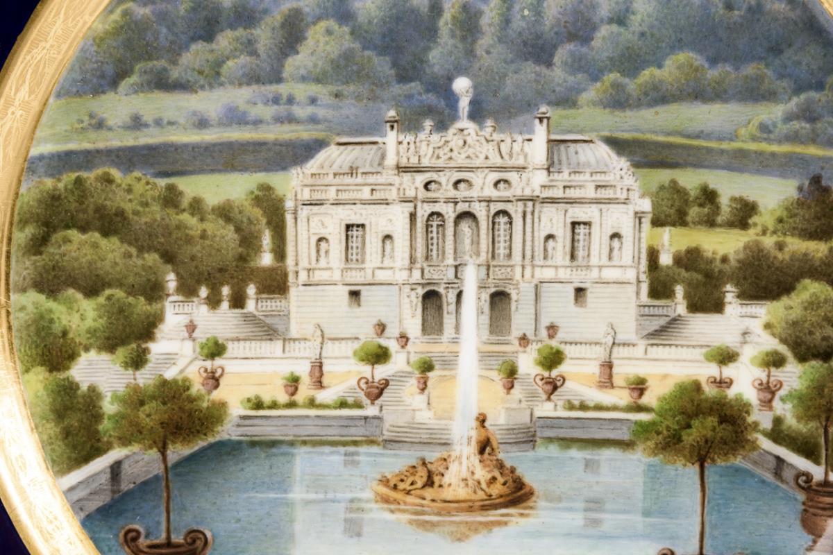 Flacher Teller mit mehrpassigem Rand und kobaltblauer Fahne. Im Spiegel die verso bezeichnete Darstellung des Schlosses Linderhof in den Ammergauer Alpen.