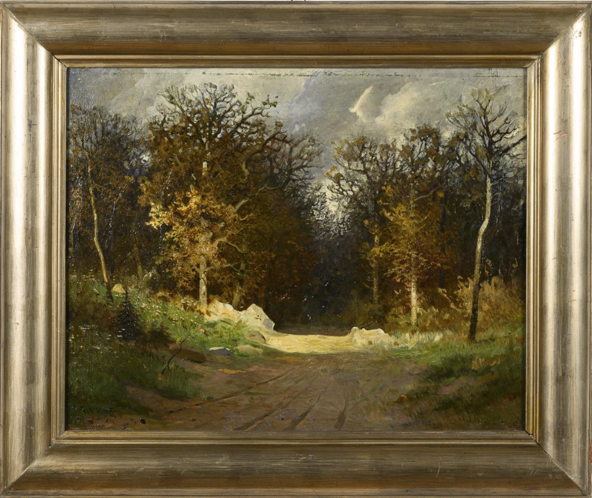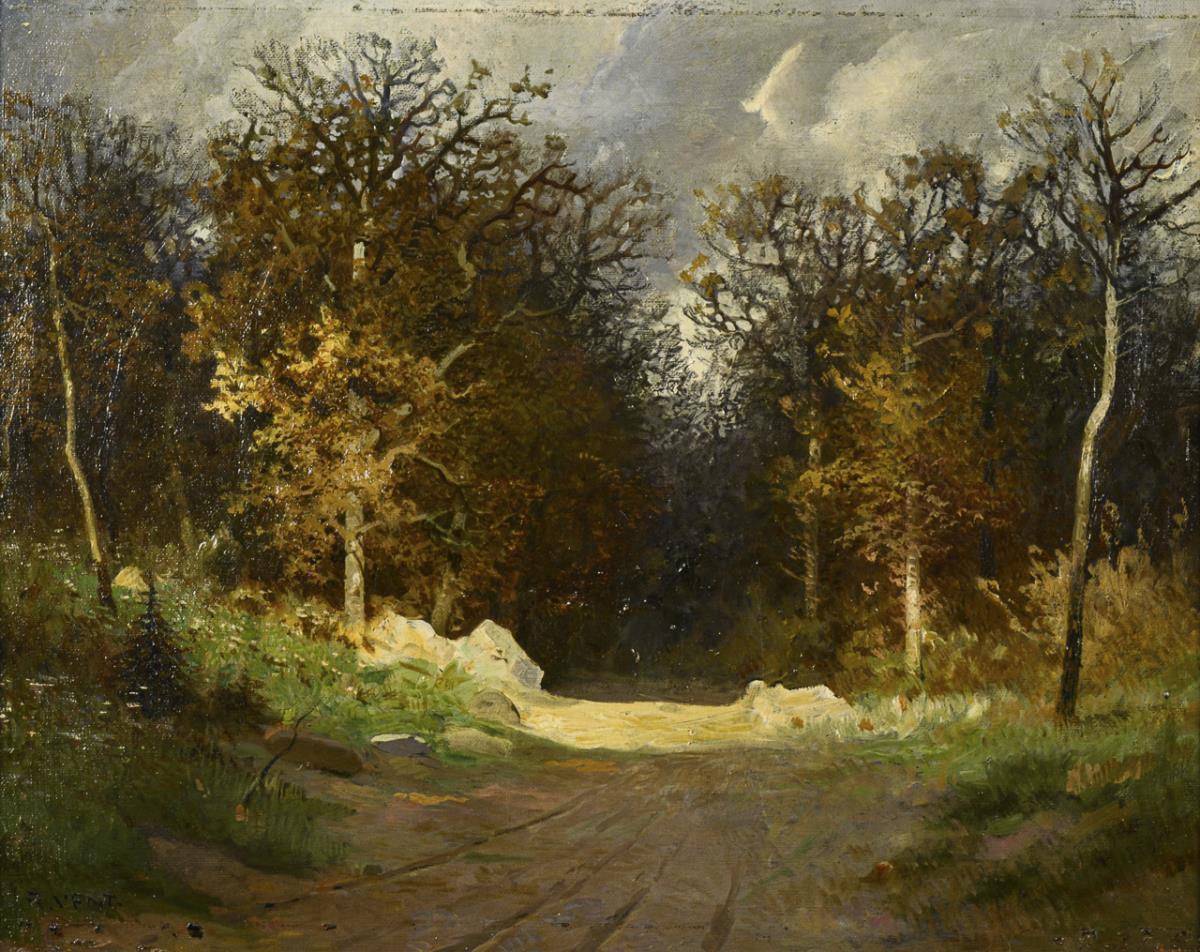 Breiter Weg mit Spurrillen nahe einem Wald mit dicht stehenden kahlen Bäumen unter Wolkenhimmel mit durchbrechenden Sonnenstrahlen. Eine kleine restaurierte Stelle mit Hinterklebung.