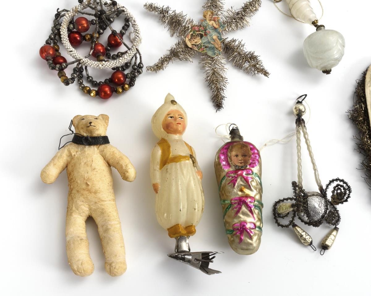 Verschiedene seltene Teile, darunter Gablonzer Schmuck, Watte-Bär, Aladin und Wickelkind aus Glas, Pfeifenputzer-Weihnachtsmann etc. Altersspuren, kleine Defekte.