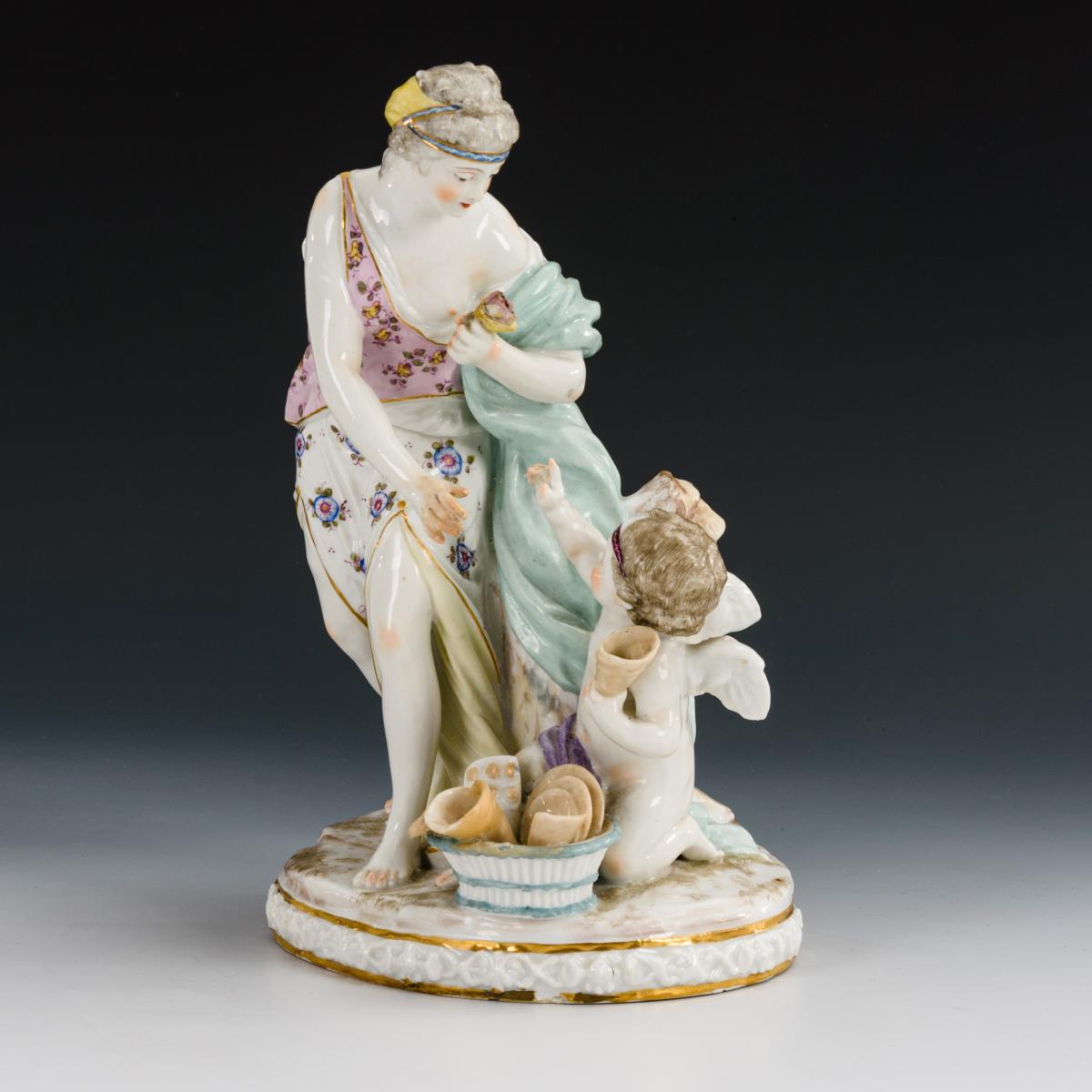 An einem Baumstumpf stehende, antikisierend gekleidete Frau, zu ihren Füßen ein Putto mit Waffeln und Waffelkorb. Bestoßung am Stand, 1 Hand und 1 Waffel restauriert, minimaler Goldabrieb.