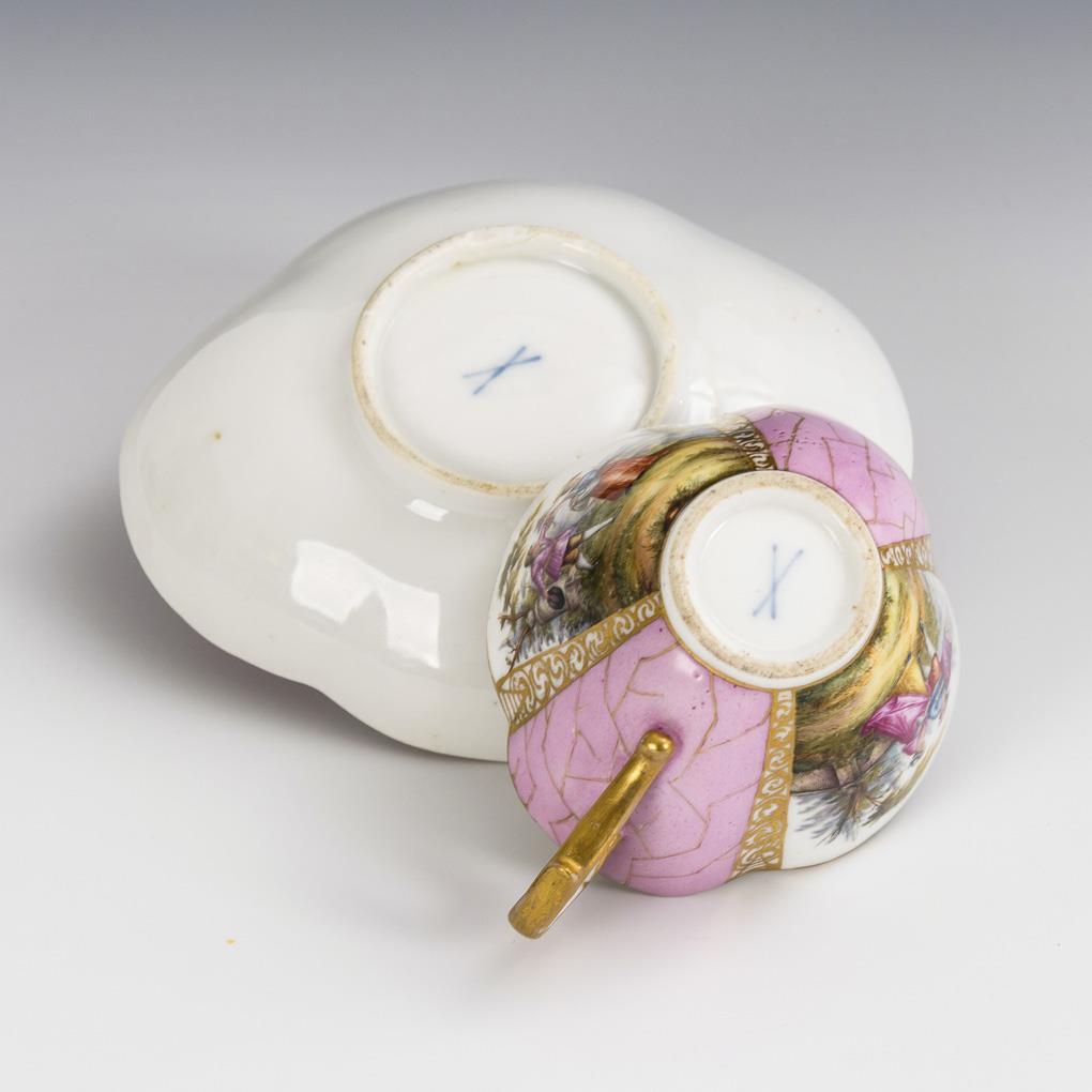 Polychrom bemalt, goldstaffiert. H Tasse 5,5 cm, Ø originale Untertasse 13,5 cm.