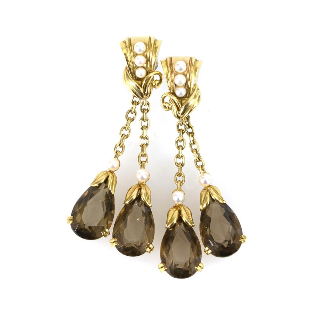 An perlchenbesetzter Brisur abgehängte, krappengefasste Rauchquarze und Perlchen. Abhängungen abnehmbar. Steckmechanik.