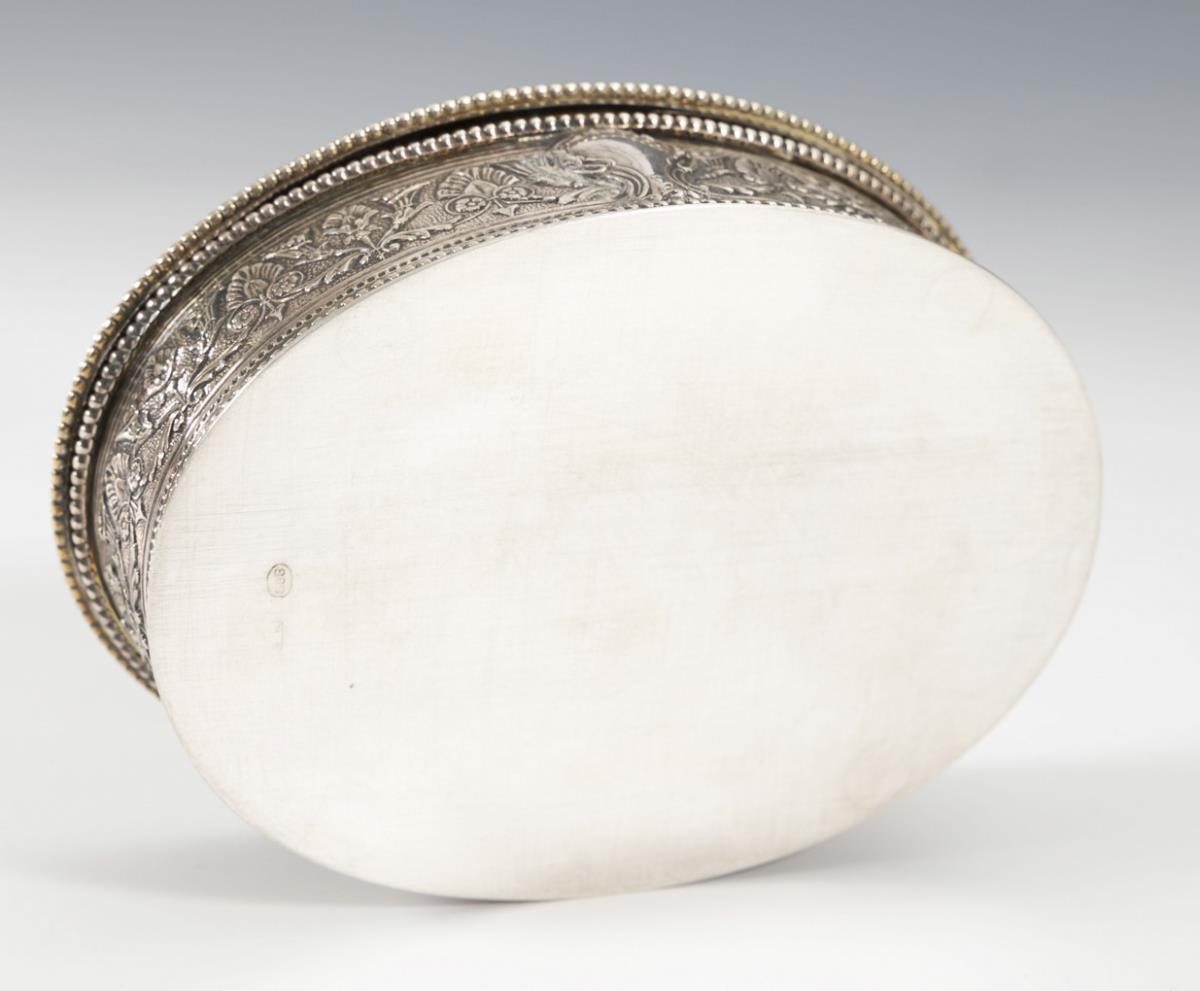 Reich reliefierte Dose mit ungravierter Rocaillenkartusche auf dem Scharnierdeckel. Leichte Gebrauchsspuren.