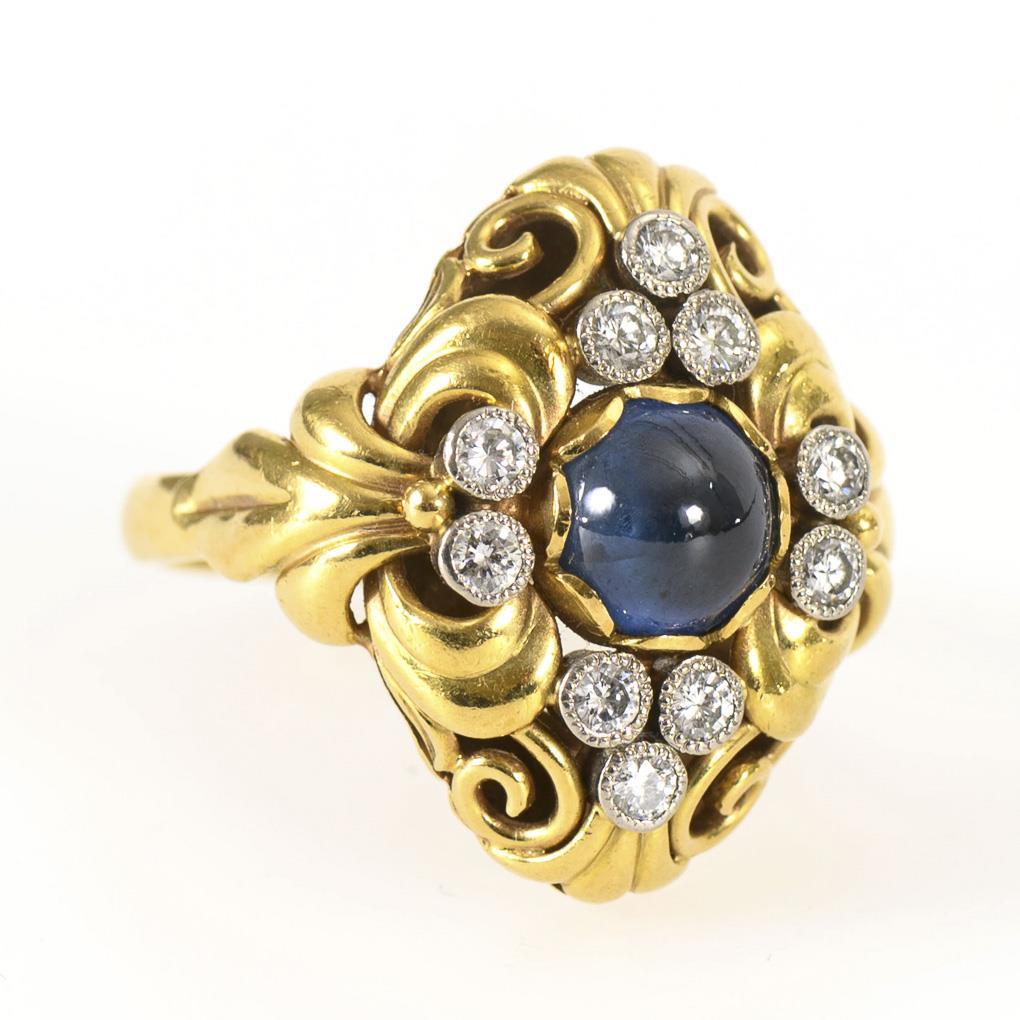 Saphircabochon, umgeben von 10 zargengefassten Brillanten in reliefiertem Ringkopf, zwischen mittlerer Schiene.