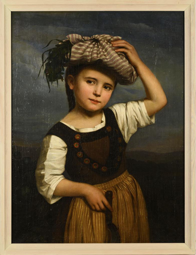 Porträt eines Mädchens in ländlicher Kleidung mit Sichel und Tuch voller Kräuter in bergiger Landschaft. Restauriert.