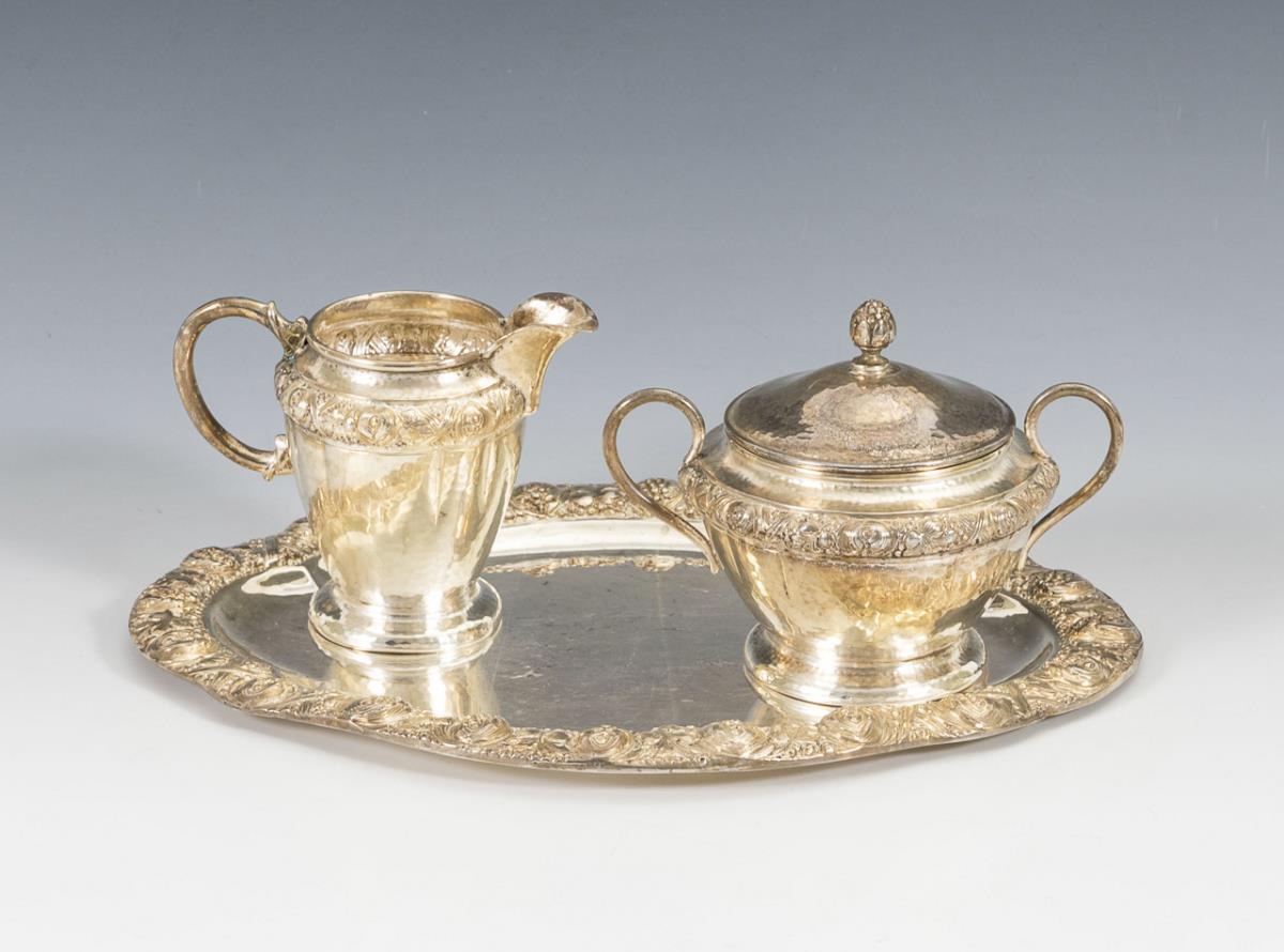 Handgetriebener Sahnegießer und Zuckerdose, auf ovalem Tablett. Dazu 3 + 2 + 2 kleine Mokkalöffelchen. Leichte Gebrauchsspuren, Zuckerdose am Stand minimal gedellt.