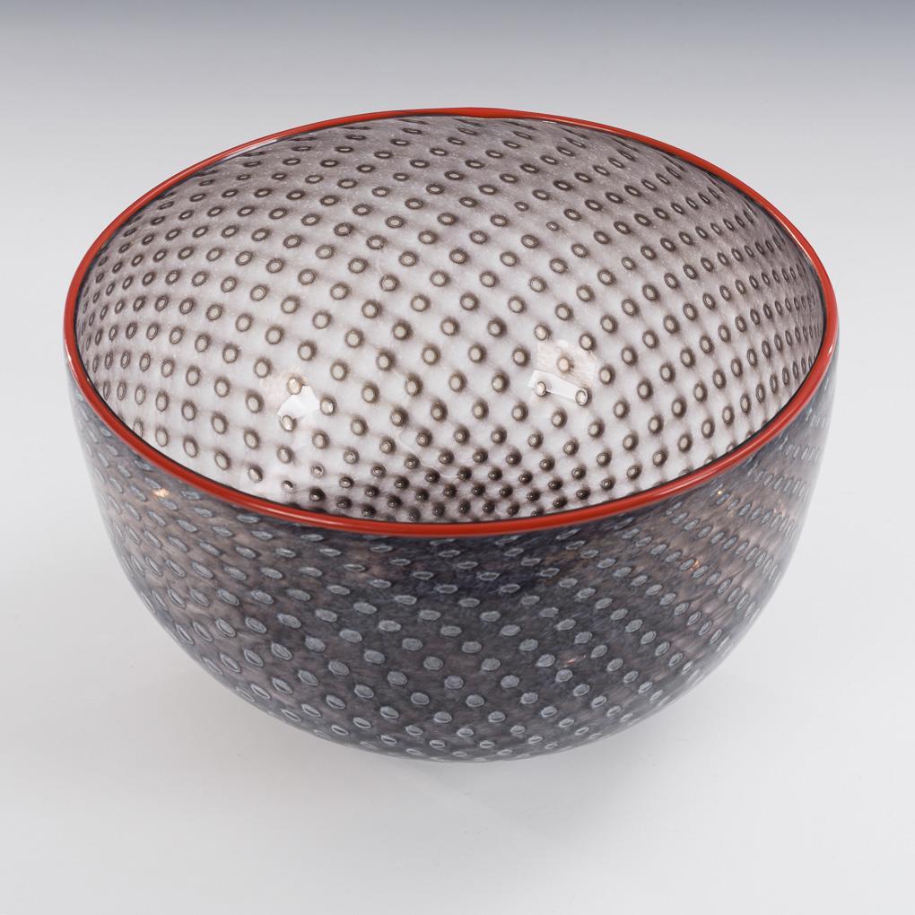 Farbloses Glas mit einem Muster aus eingestochenen Luftblasen, rauchfarbenen und opalweißen, gitterartigen Schlieren und auf den Rand aufgeschmolzenen opakroten Faden. H 15 cm, Ø 23,5 cm.