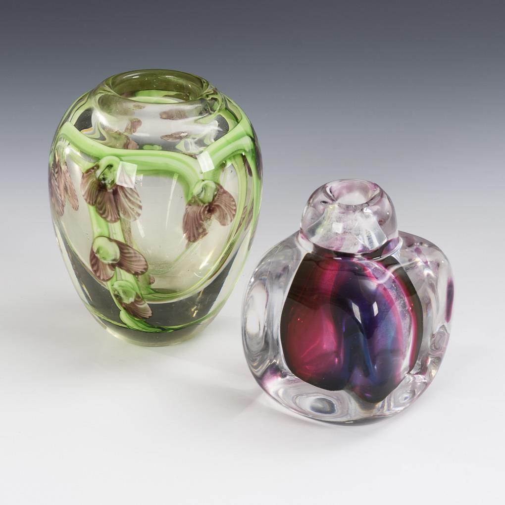 1x Balustervase aus farblosem Glas mit in der Zwischenschicht eingeschmolzenen, stilisierten Blütenstängeln aus grünem, opalweißen und violettem Glas. / 1x quadratische Vase aus farblosem Glas mit weinrotem Innenfang.