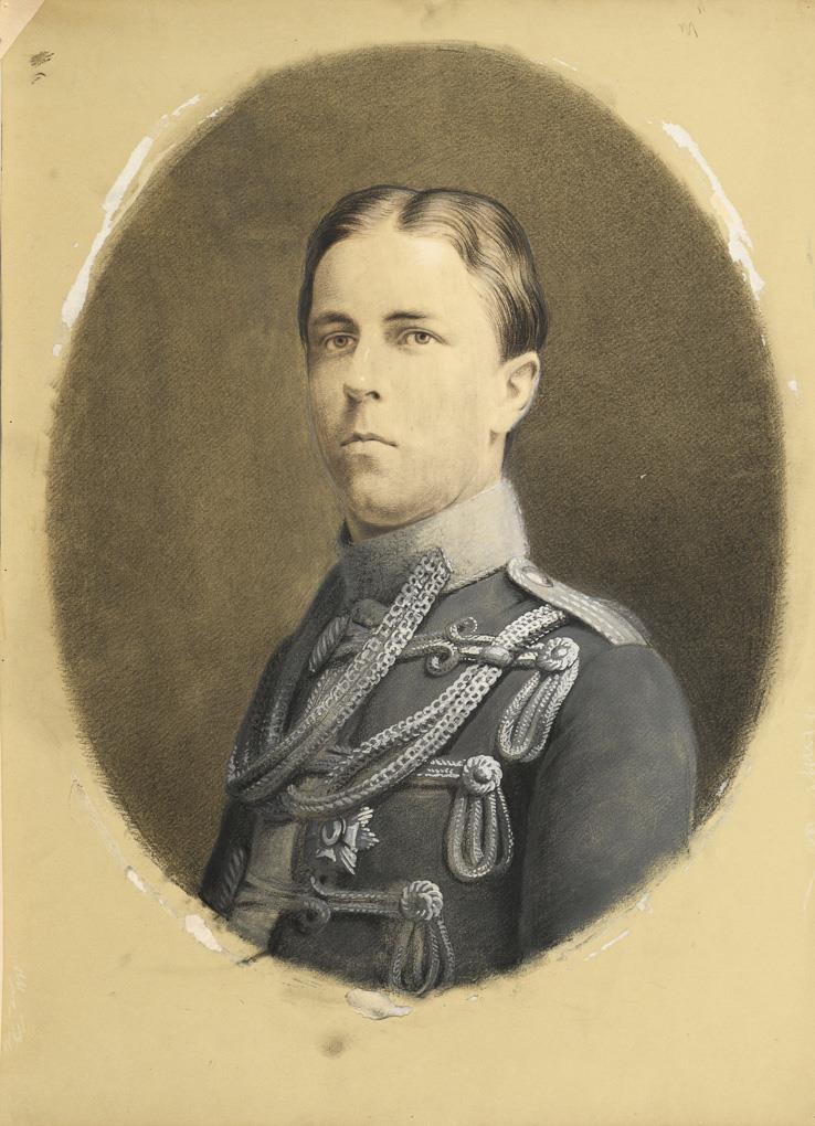 Oval gemalte Porträts des Prinzen (1858 - 1928) in Uniform und mit Orden sowie seiner Frau im hochgeschlossenen Kleid mit Schleife. Klebespuren am Karton außerhalb der Darstellung.