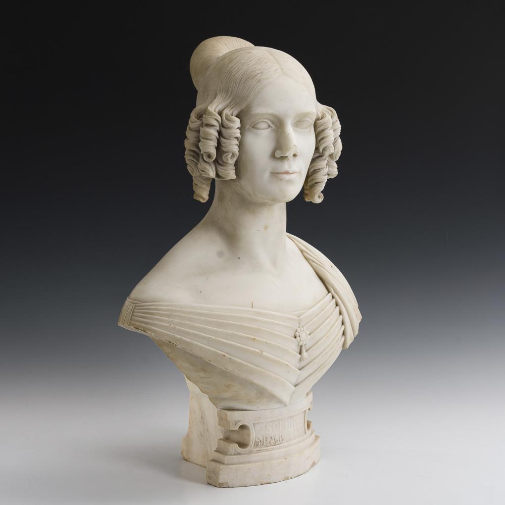 Weißer Marmor, wohl Carrara. Auf der Sockelfront "Sophie S.E. AE. L. Reuss“ betitelt, auf der Standfläche Nr. "67". H 63 cm. 47,5 kg.