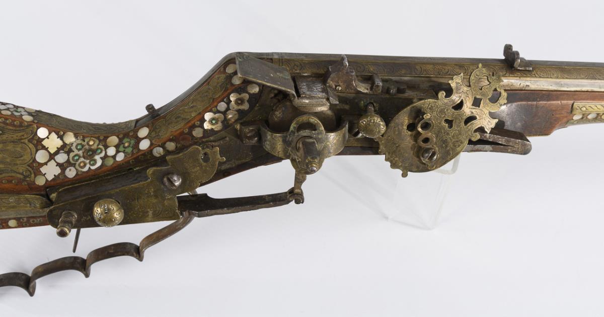 Jagdbüchse mit sechszügigem Lauf, außen achtkantig, dieser dreifach mit gravierten Messingeinlagen geschmückt. Schaft reich mit Messing-, Perlmutt-, Bein- und grünen Steinintarsien belegt. Kimme und Korn sowie Ladestock vorhanden. Guter Erhaltungszustand und schöne Alterspatina. Wenige Intarsien besonders am Kolbenende fehlen. Hahn lose, da die Schraube fehlt. Schieber funktioniert. Durchbrochen gearbeitete Abdeckung der Feder für den Hahn etwas verbogen. Kolbenkammer klemmt.