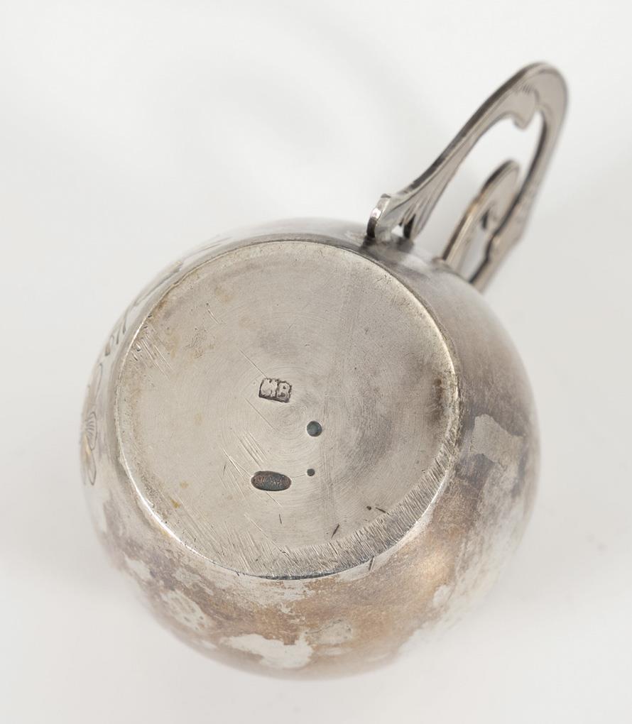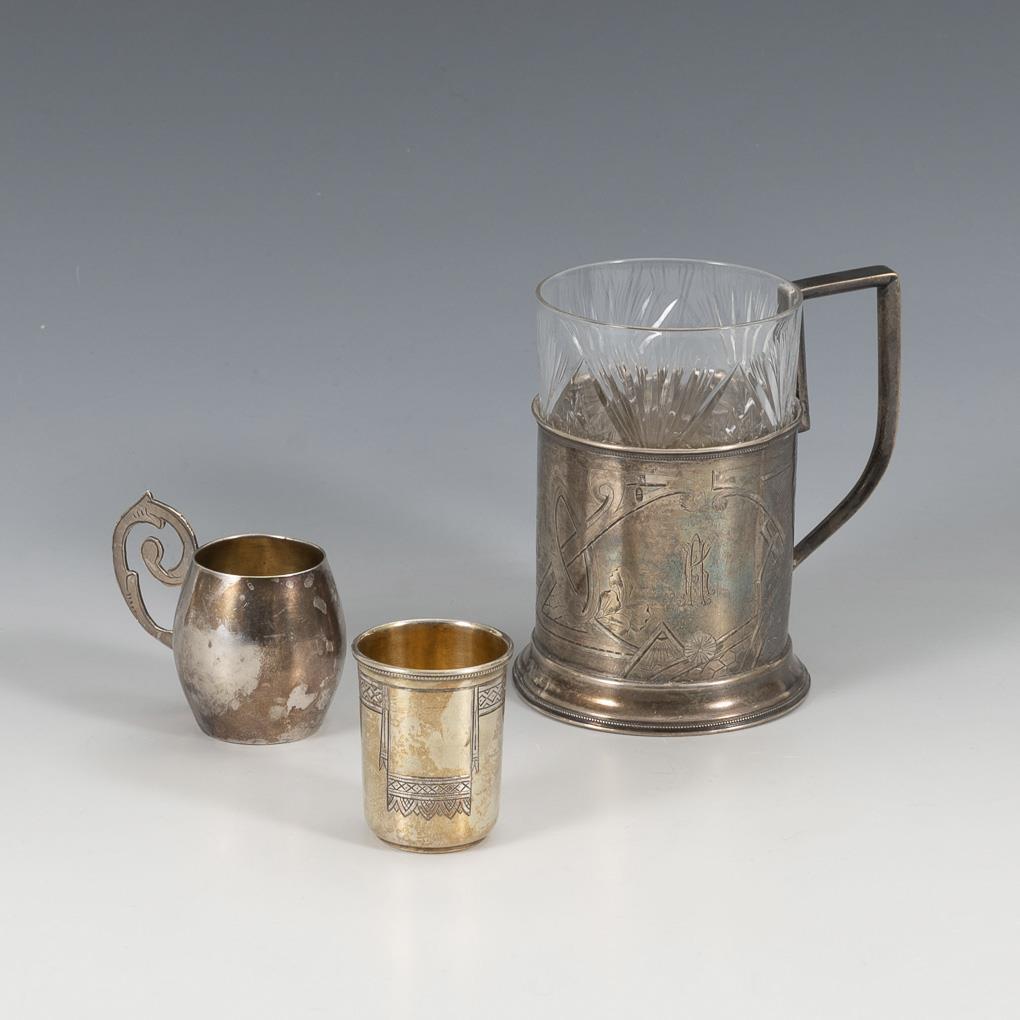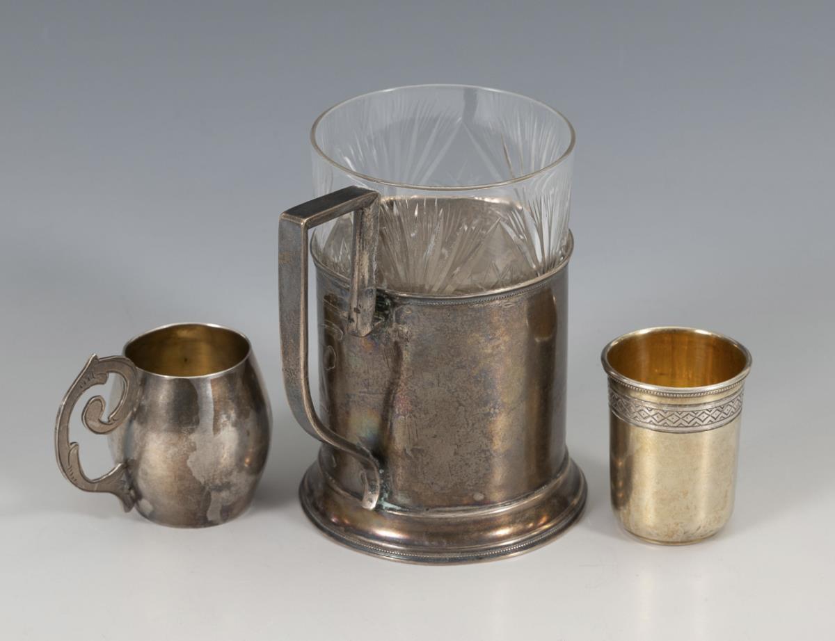 Teeglashalter mit geschliffenem Glaseinsatz und 2 silberne Schnapsbecher. Gedellt, Lötstellen.