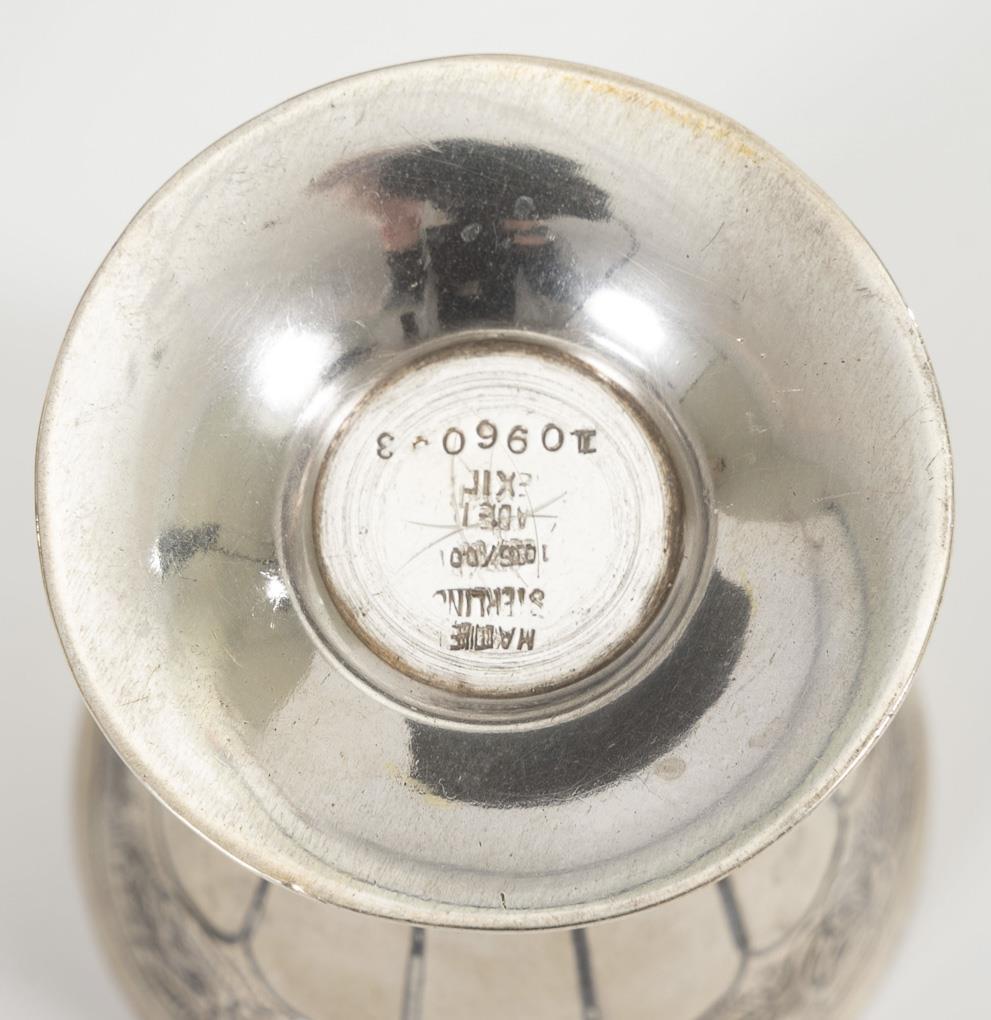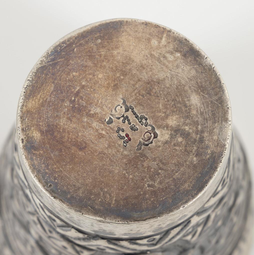 Konischer Fußbecher mit Rosendekor, H 7,9 cm. Konischer Becher mit figürlichen Reliefdarstellungen, H 7 cm. Minimal gedellt.