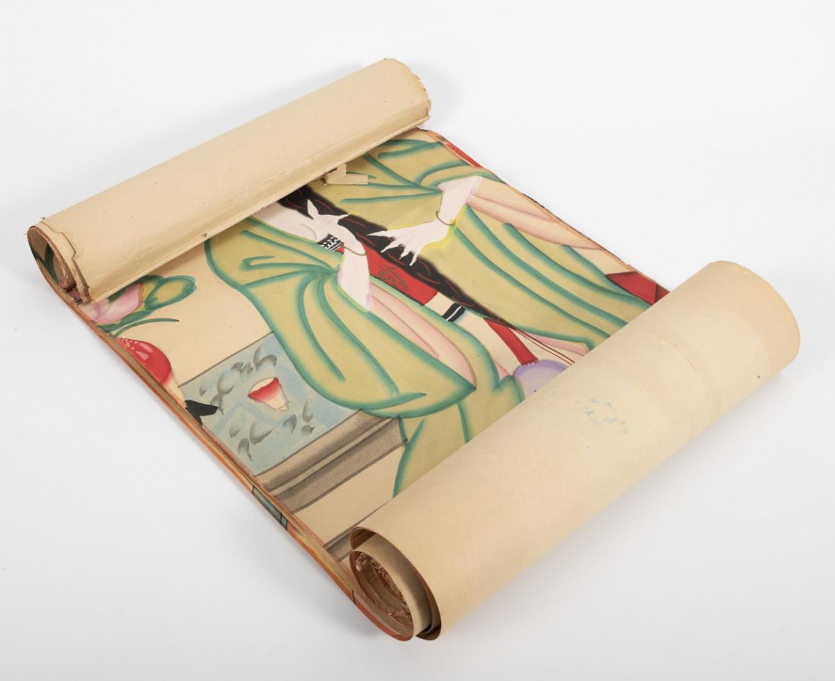 Wohl paarweise zu hängen. Zwei Frauen beim Zöpfe flechten und kämmen. Zwei Frauen mit Kindern und zwei weitere beim Spinnen oder Nähen. Alle mit geschnürten Füßen. Stärkere Altersspuren, mehrere Einrisse.