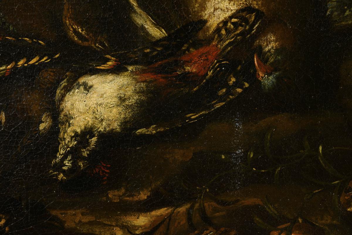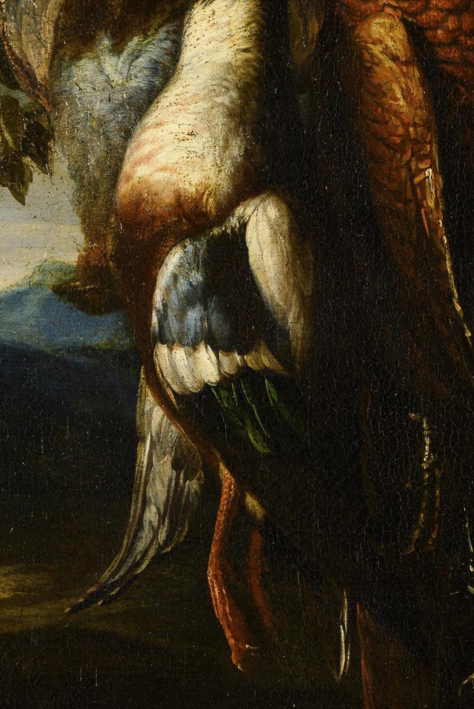 Qualitativ hervorragende Darstellung der Beutevögel mit Gewehr an einem Baum in weiter Gebirgslandschaft unter wolkigem Himmel. Leinwand doubliert, ein kleines Loch.
