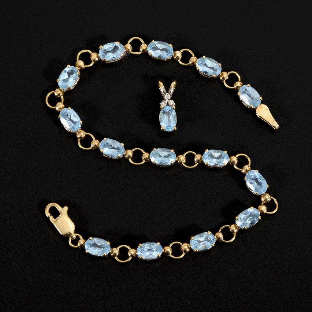 14 krappengefasste Steine zwischen Ringösen an Karabinerschließe. Passender Anhänger mit Blautopas und 3 kleinen Diamanten.