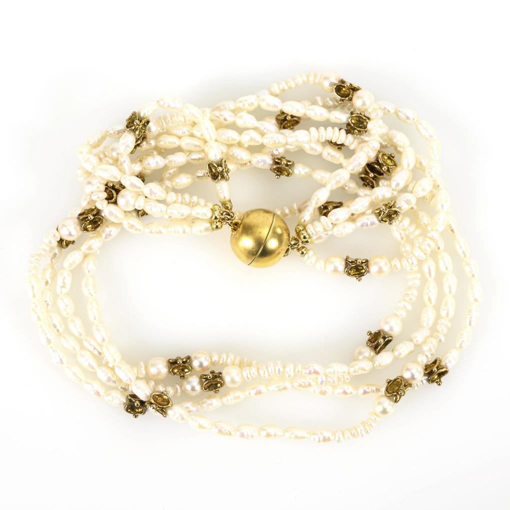 Schnürketten mit reisförmigen, runden Zuchtperlen und Ziergliedern, an Patent-Magnetkugelschließe.
