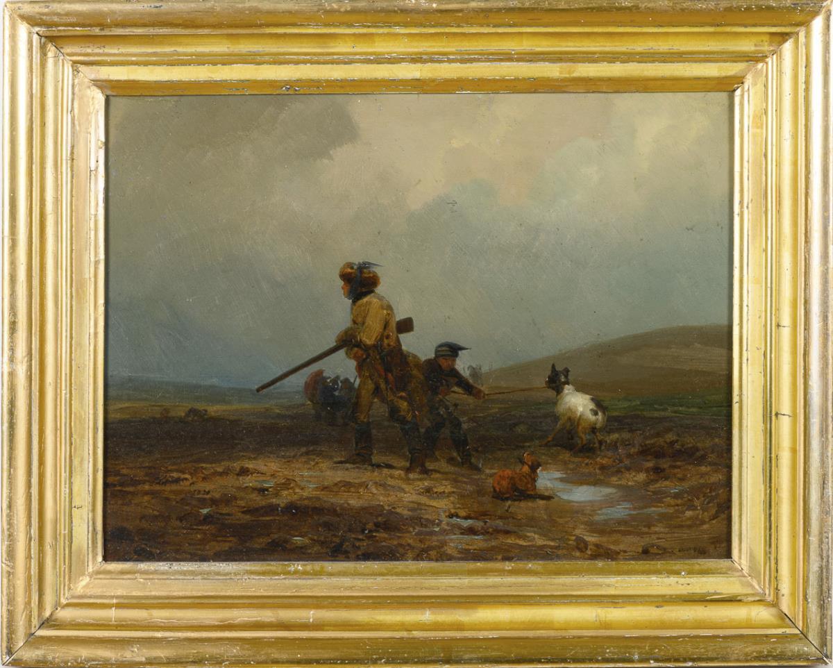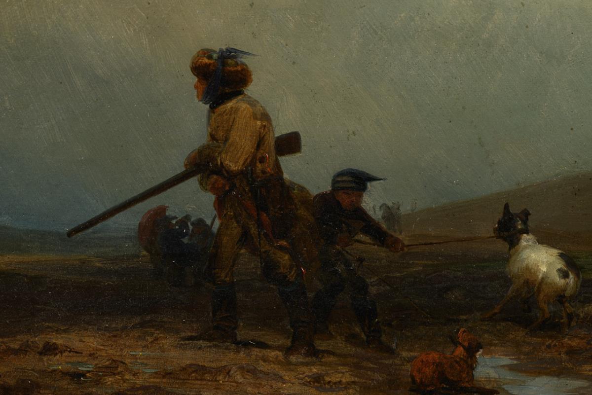 Die Jäger mit den Hunden auf matschigem Feld an einem trüben Tag. Leichte Altersspuren.