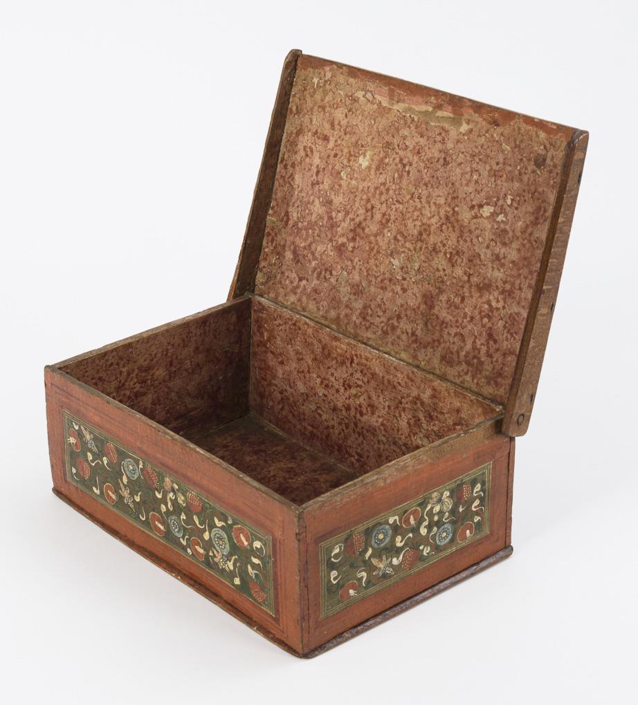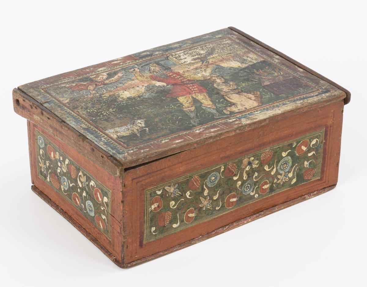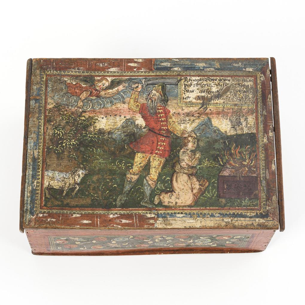Auf dem Scharnierdeckel in mehrfarbiger Rahmung die Szene aus dem Alten Testament: Abraham steht mit erhobenem Schwert hinter seinem knienden Sohn am Opferfeuer, während ein Engel die Opferung verhindert und auf den Widder weist; im Bild eine erklärende Schrifttafel. Auf allen Seiten des Kastens ornamentale Blumenranken in den rot gerahmten Scheinkassetten. Stärkere Alters-/Gebrauchsspuren, 1 Wange des Deckels ersetzt.