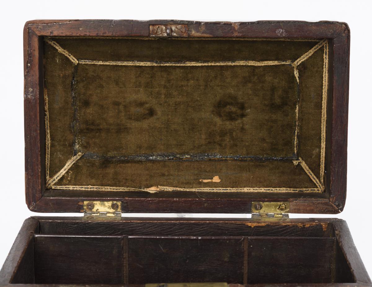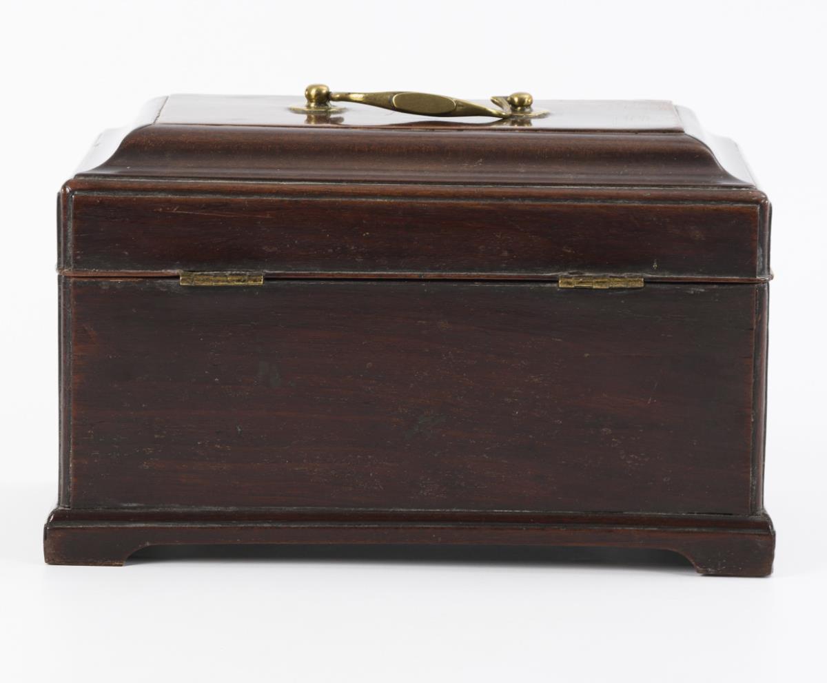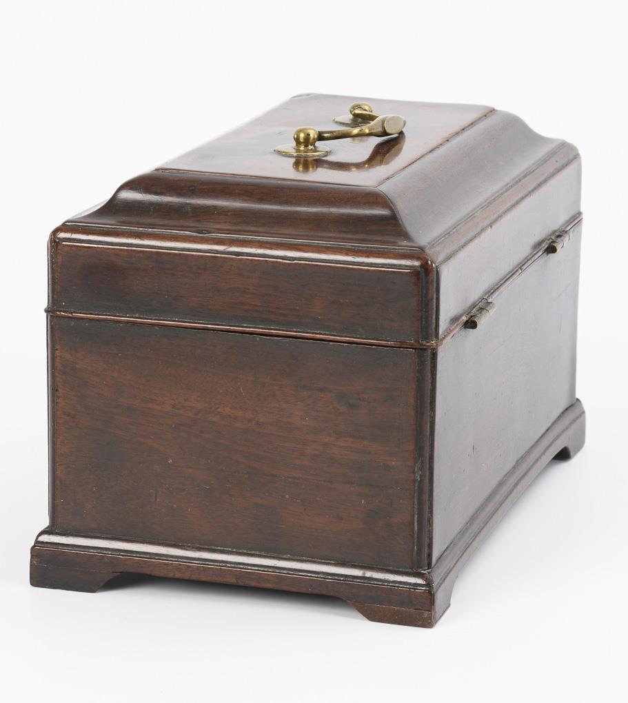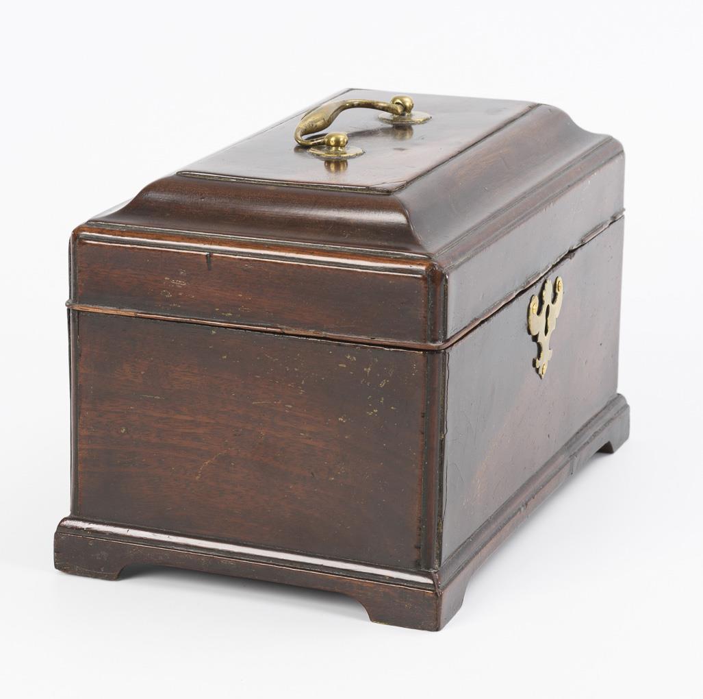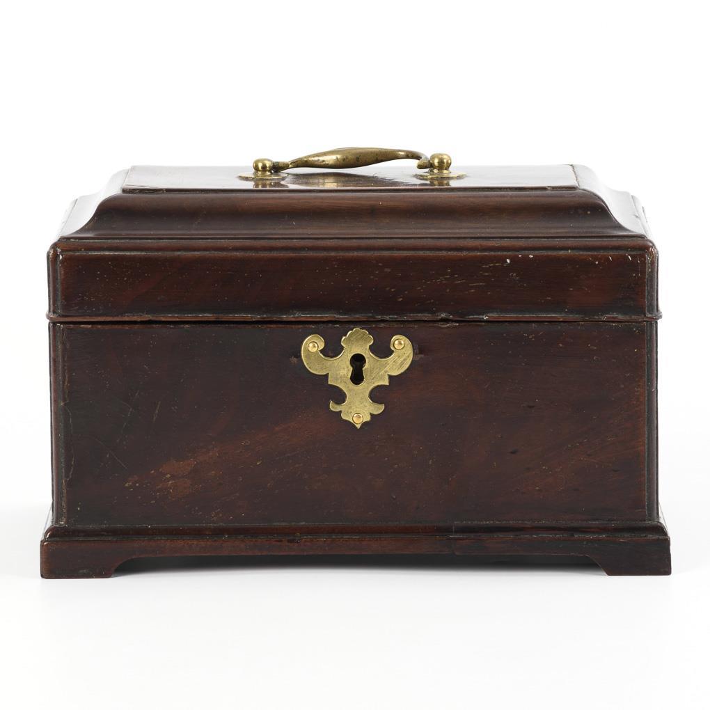 Hochwertig gearbeitetes Tea-Caddy mit aus der Sockelleiste ausgesägten Füßen, allseits eingezogen gerundeten Kanten, profiliertem Scharnierdeckel und scharniertem Tragegriff sowie ornamentale Schlüssellochblende in der Front. Auch innen furnierte Schatulle mit grünem Samtbezug im Deckel sowie Stellwand für die Fachung. Restauriert, einige kleinere Ergänzungen, 2 fehlende Stellwände, entferntes Geheimfach.