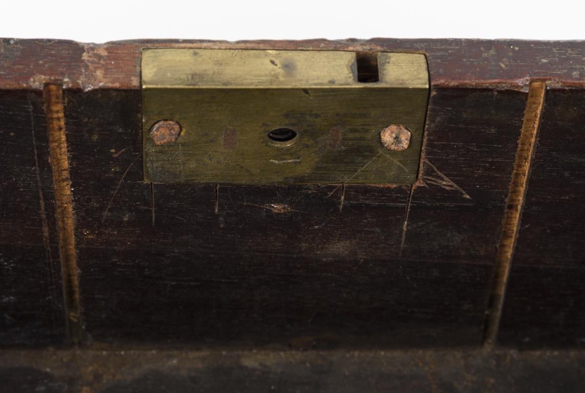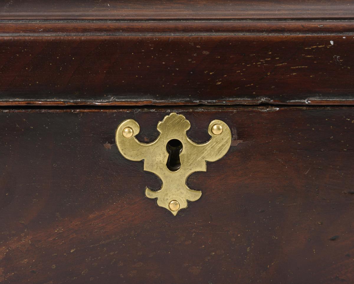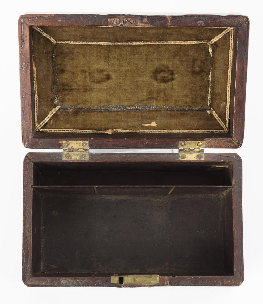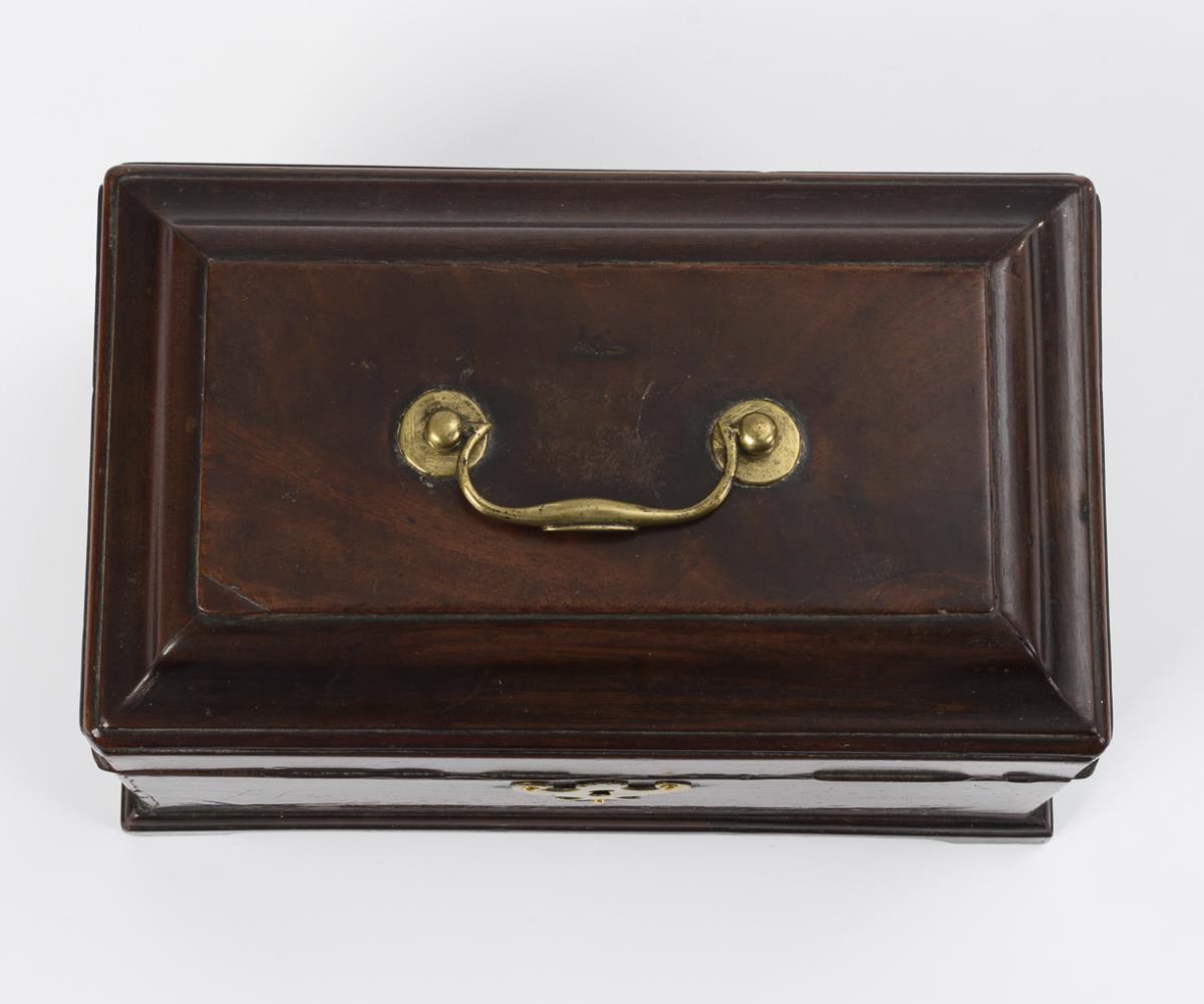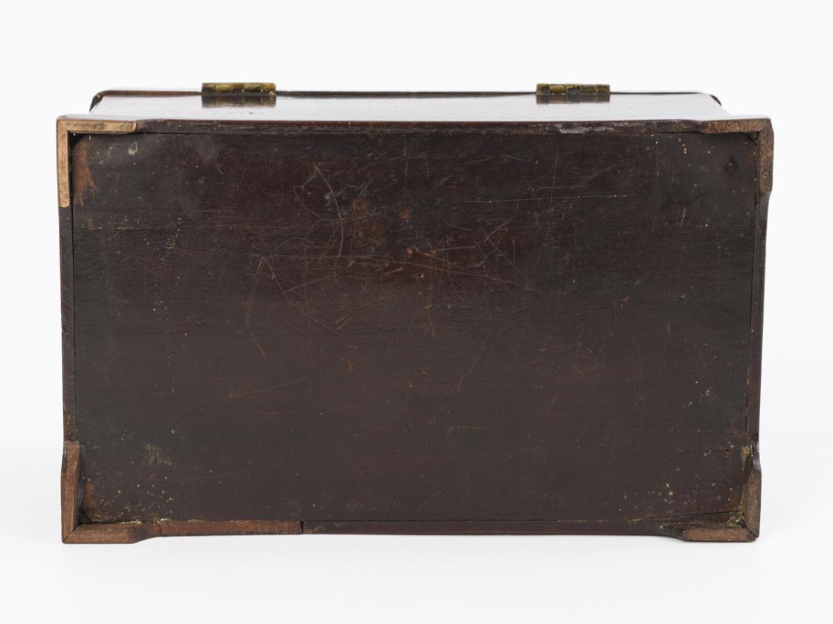 Hochwertig gearbeitetes Tea-Caddy mit aus der Sockelleiste ausgesägten Füßen, allseits eingezogen gerundeten Kanten, profiliertem Scharnierdeckel und scharniertem Tragegriff sowie ornamentale Schlüssellochblende in der Front. Auch innen furnierte Schatulle mit grünem Samtbezug im Deckel sowie Stellwand für die Fachung. Restauriert, einige kleinere Ergänzungen, 2 fehlende Stellwände, entferntes Geheimfach.