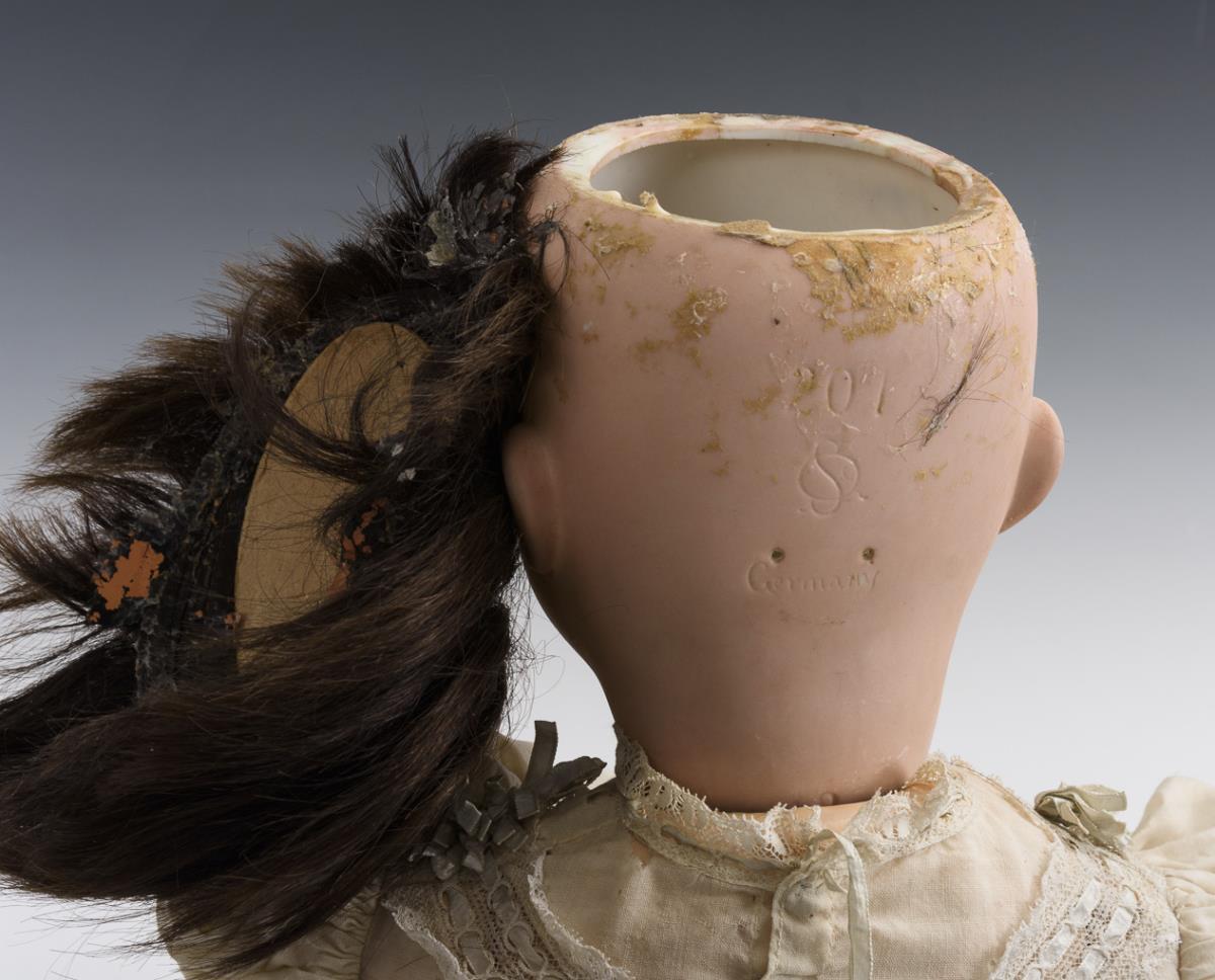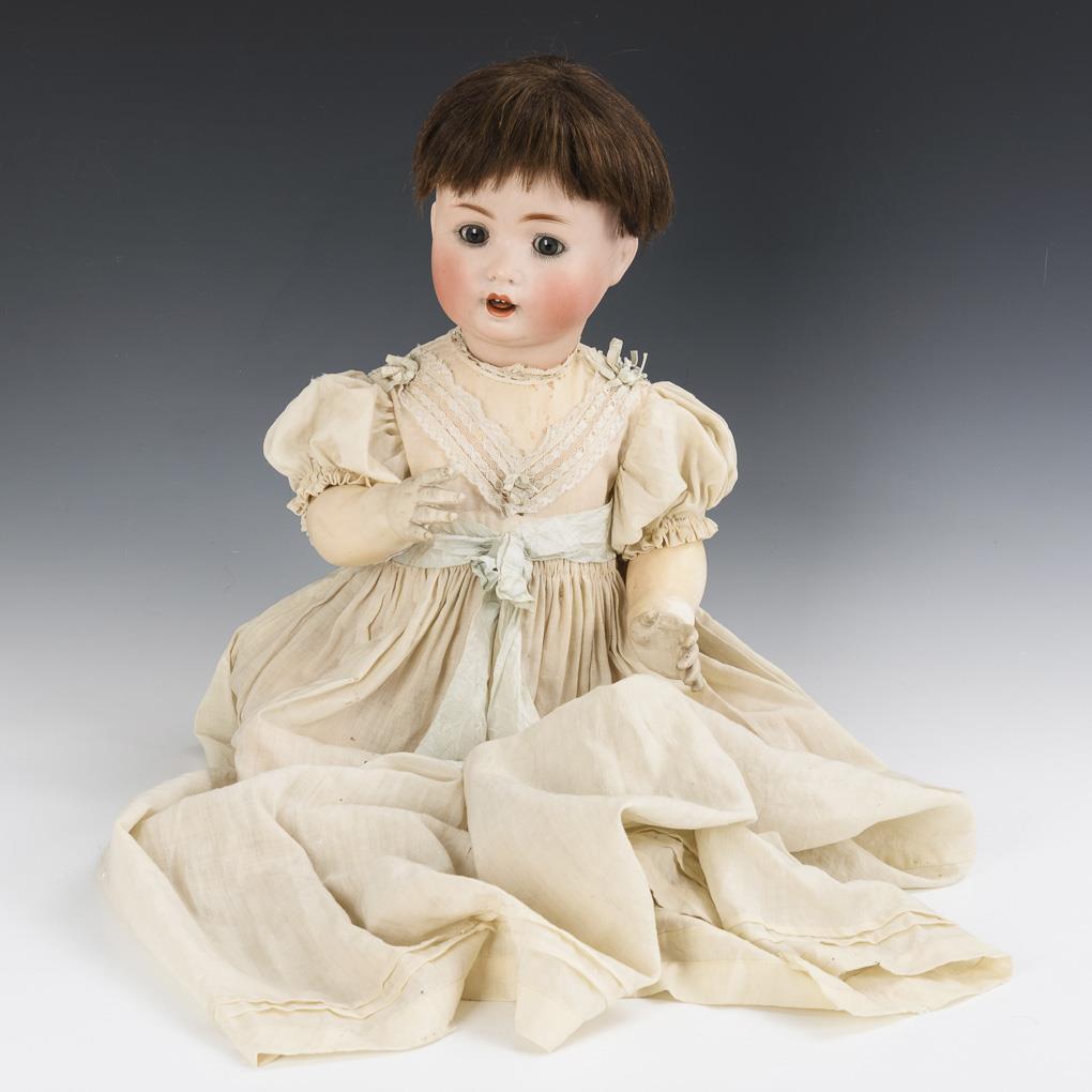 Kurbelkopf, blaue Schlafaugen, braune Echthaarperücke. 5-teiliger Sitzbabykörper. Langes weißes Kleid mit Defekten. Kopf mit kurzem Haarriss an der Stirn. Arme verblichen, 1 Finger mit kleinem Defekt.