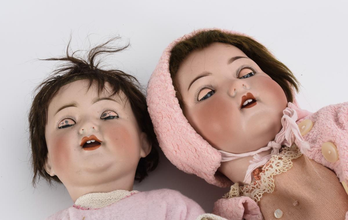2 rosa bekleidete Charakterbabys. Armand Marseille und Kämmer & Reinhardt.