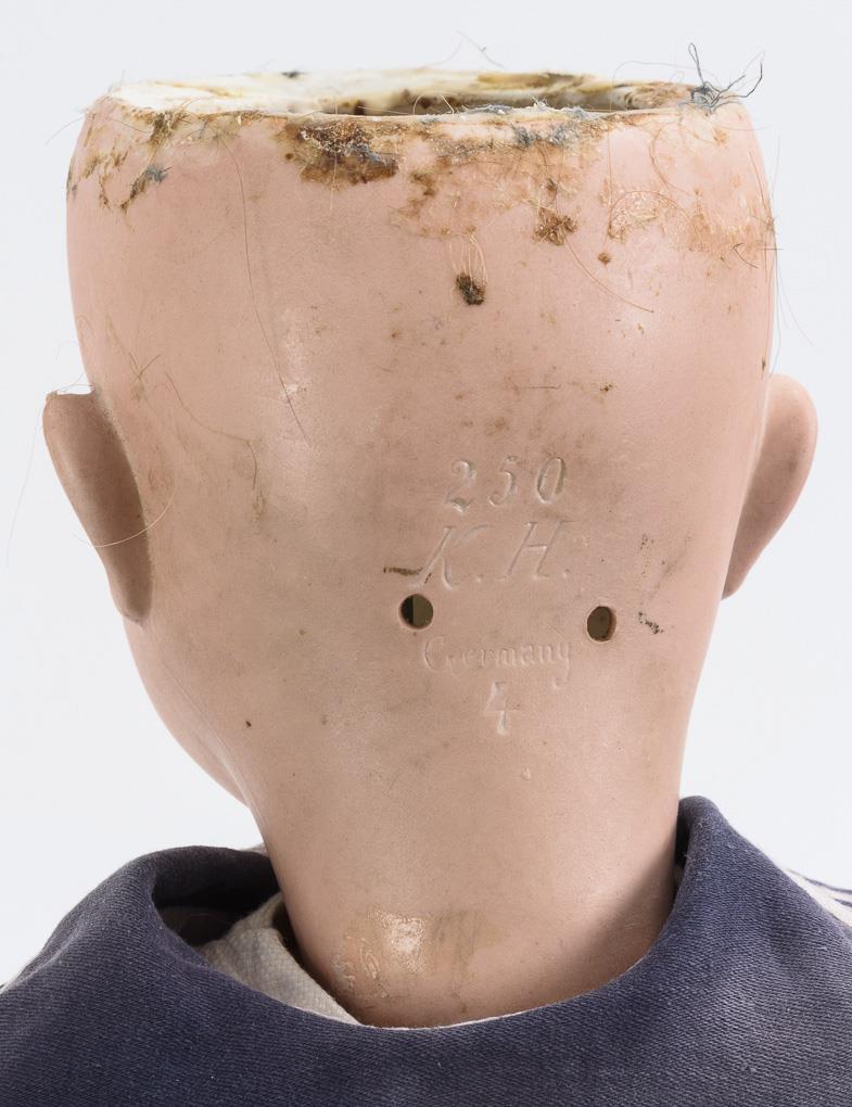 Mädchen Kley & Hahn oder Karl Hartmann, Stockheim, gemarkt 250/K H /Germany. Braune Echthaarperücke mit Zöpfen, Schlafaugen. 15-teiliger Gliederkörper mit Celluloidhänden. Weißer Anzug mit blauem Kragen, schwarze Wachstuchschuhe, Charakterjunge gemarkt Heubach-Köppelsdorf 342 7 Germany. Biskuit-Kurbelkopf, braune Schlaf-/Schelmenaugen, Wimpernreste, braune Echthaarperücke. 5-teiliger Sitzbabykörper mit intakter Stimme. Blau-weißer Matrosenanzug mit passendem Mützchen. Mädchen: Kopf durchleuchtet: 1 kleiner Perückenpull und 1 herstellungsbedingter Chip an der Kopfkrone sowie 1 kurzer Brandriss an der Halskurbel. Junge: Kleiner Ausbruch am Kopffalz (Ohne Riss!), minimaler Perückenpull. Körper mit kleinen Defekten.