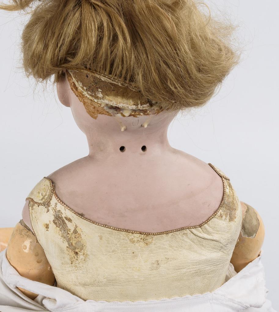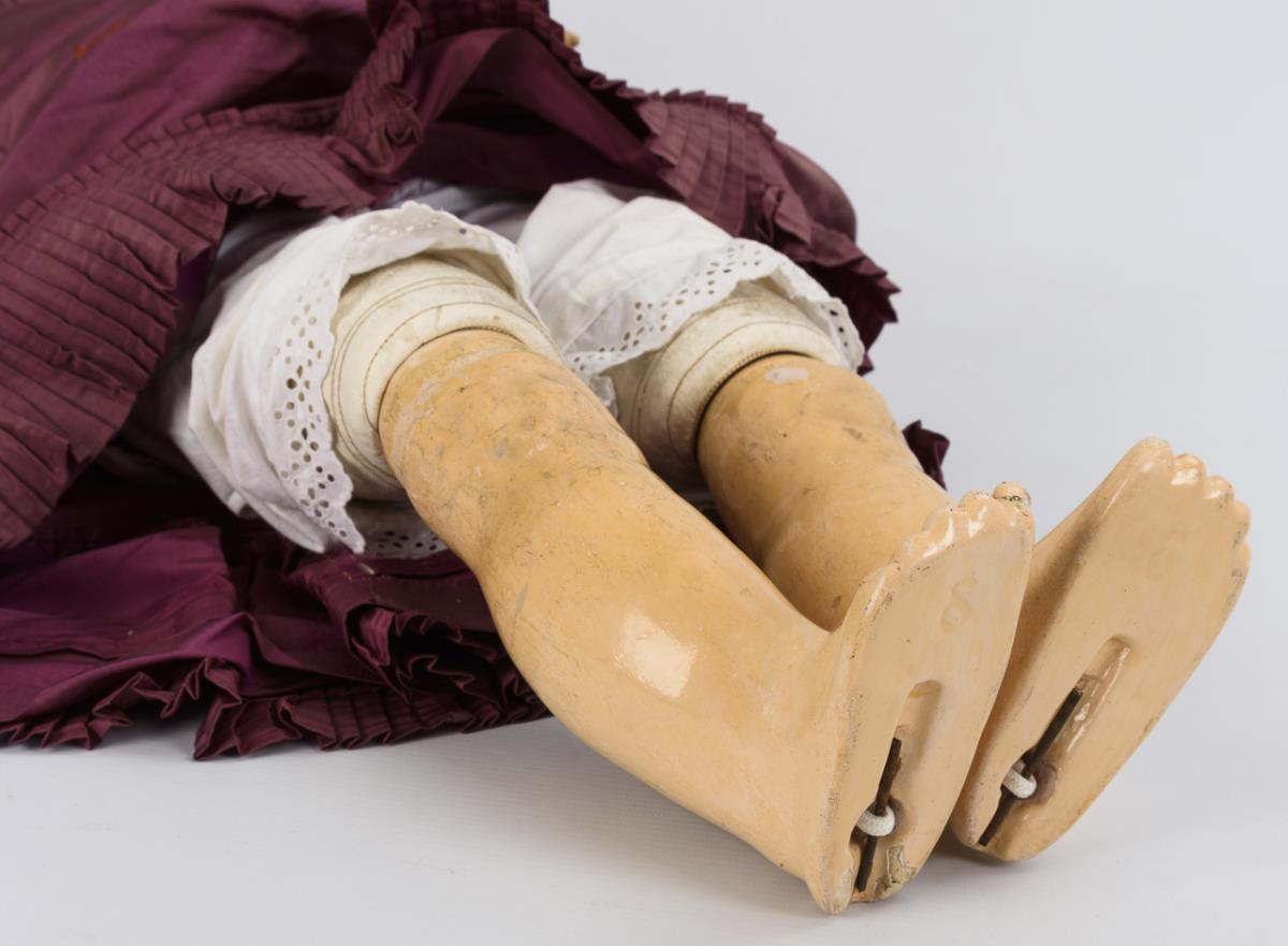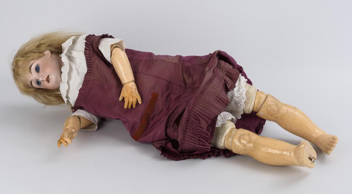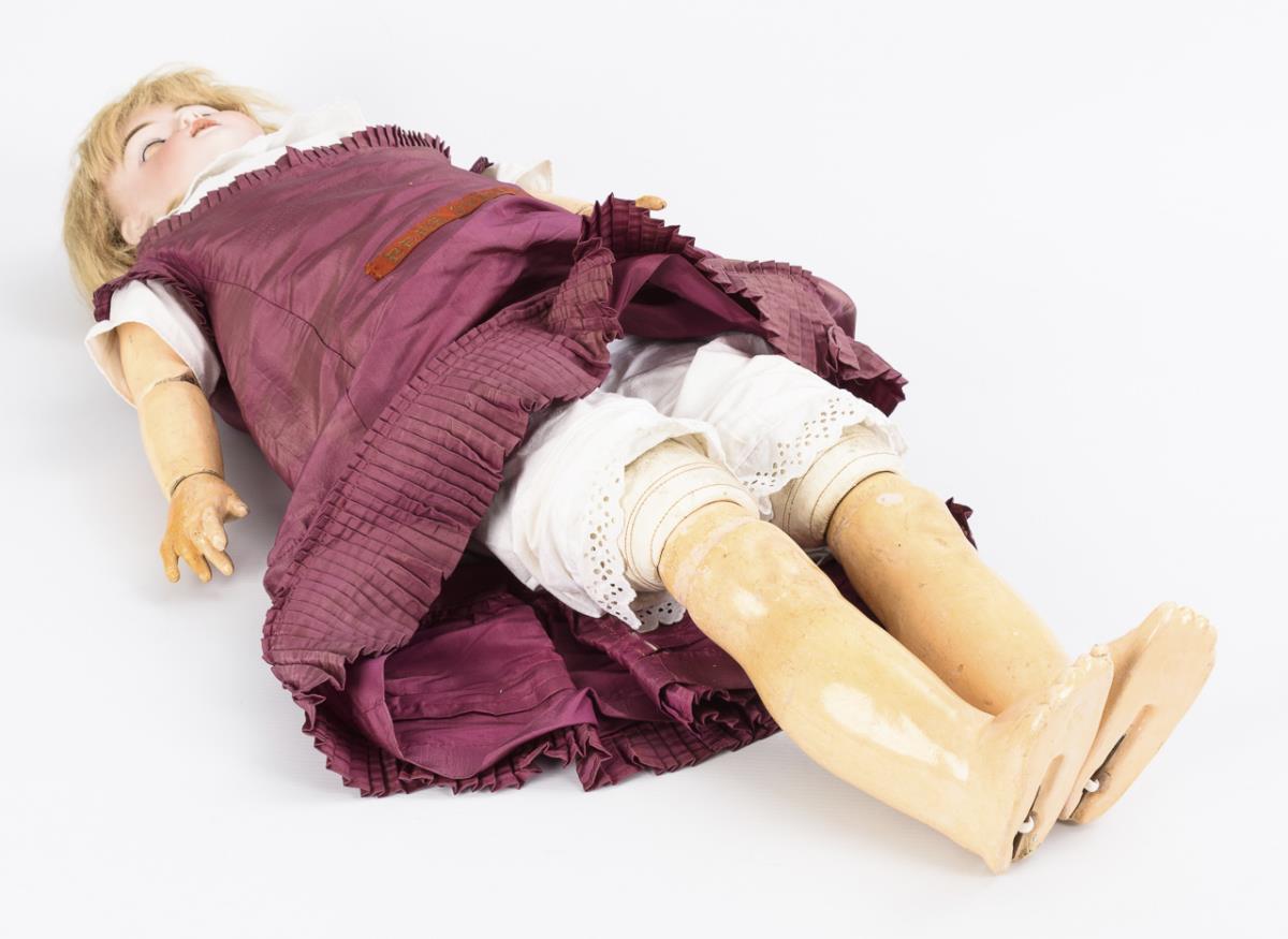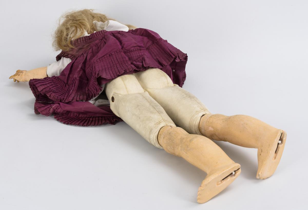 Blaue Schlafaugen, blonde Echthaarperücke. Lederkörper mit ungewöhnlicher Fußaufhängung, Arme und Knie mit Kugelgelenken. Brombeerfarbenes Kleid, schwarze Kinderschuhe. Kopf nicht durchleuchtet: keine Defekte sichtbar. Hände restauriert.