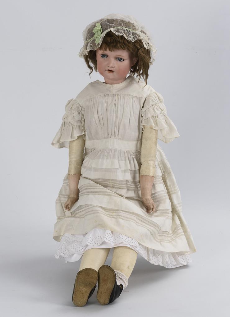Kurbelkopf mit Brustplatte, blaue Schlafaugen, blonde Mohairperücke. Lederkörper mit Zwickeln an Knien und Ellenbogen, Unterarme aus Biskuit. Weißes Kleid, Häubchen, schwarze Schuhe. Kopf durchleuchtet: ohne Defekte, lediglich etwas Perückenpull, Augen mit "Spiel". Sehr gut erhaltener weißer Ziegenlederkörper, 1 Beinsplint lose.