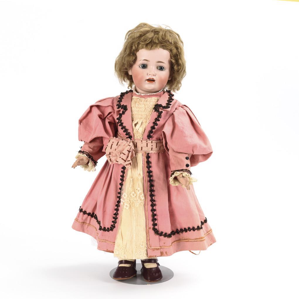 Kurbelkopf, blaue Schlafaugen, blonde Mohairperücke. 15-teiliger Toddlerkörper. Kleid mit schwarzen Paspeln, in alter Art, weinrote Lederschuhe. Kopf durchleuchtet: ohne Defekte. 2 Finger geklebt.
