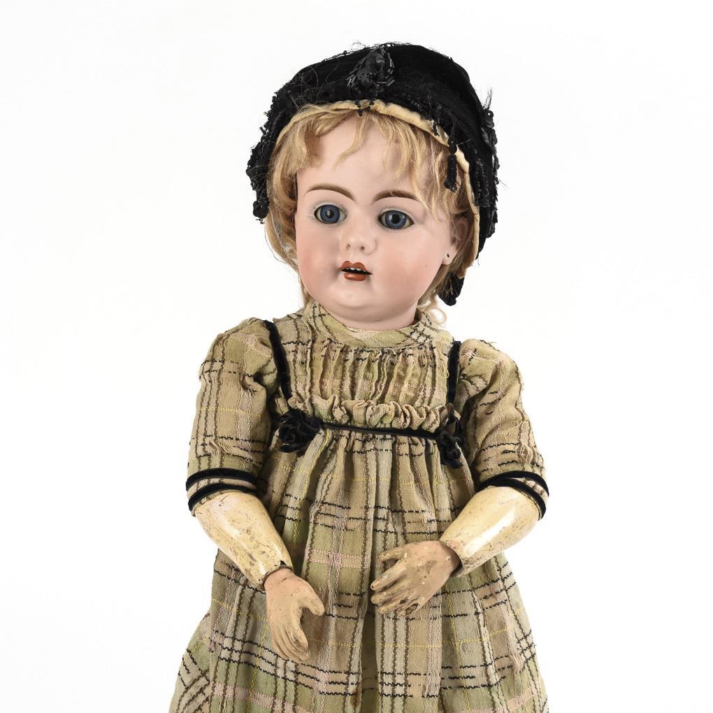 Kurbelkopf, blaue Schlafaugen, Ohrlöcher, blonde Mohairperücke. 11-teiliger Gliederkörper. Helles Kleid mit schwarzen Samtbändern, schwarze Haube, braune Strümpfe, alte braune Lederschuhe. Kopf durchleuchtet: winziger Chip am Kopffalz und kleine Chips an den Ohrlöchern. Körper mit Übermalungen und kleinen Bestoßungen.
