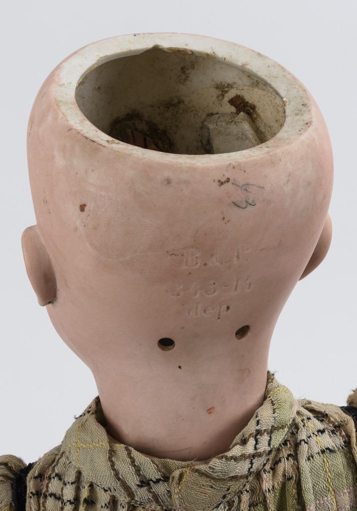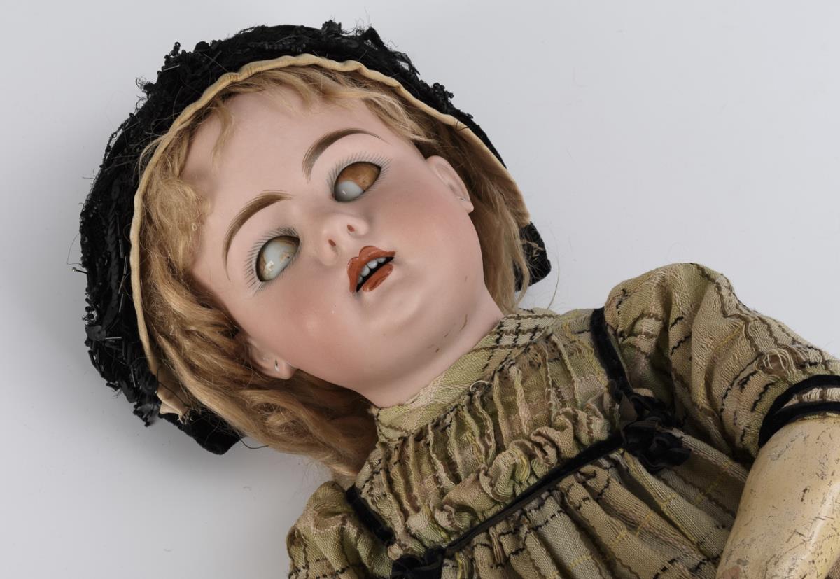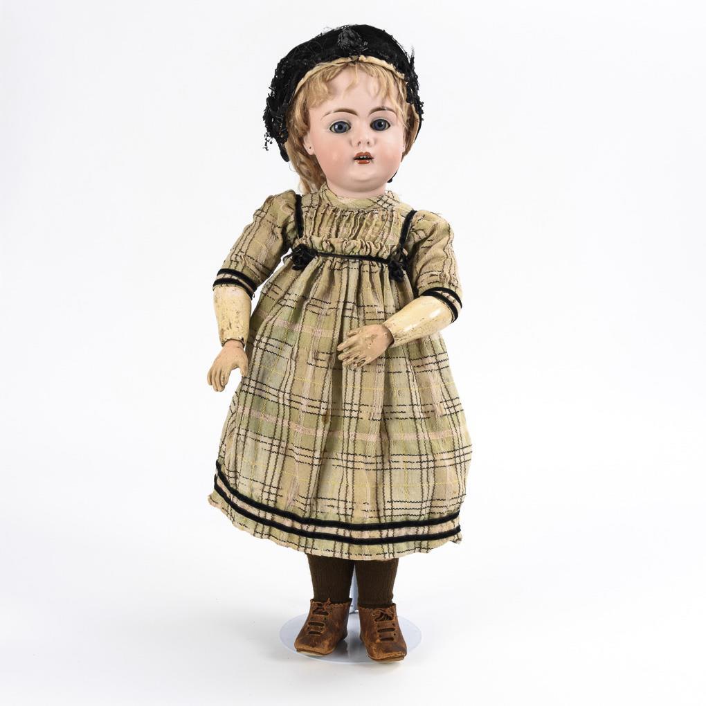 Kurbelkopf, blaue Schlafaugen, Ohrlöcher, blonde Mohairperücke. 11-teiliger Gliederkörper. Helles Kleid mit schwarzen Samtbändern, schwarze Haube, braune Strümpfe, alte braune Lederschuhe. Kopf durchleuchtet: winziger Chip am Kopffalz und kleine Chips an den Ohrlöchern. Körper mit Übermalungen und kleinen Bestoßungen.